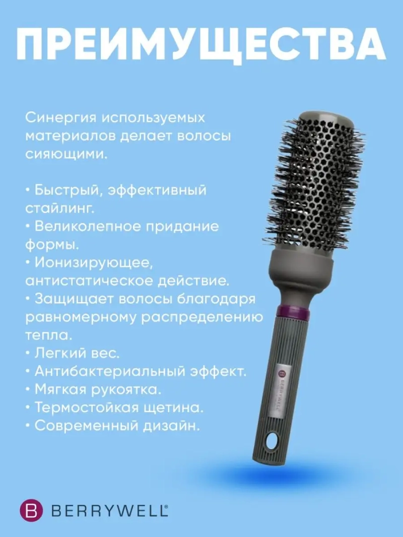 Расческа 33 мм CERAMIC-IONIC ROUND BRUSH. Высококачественная, профессиональная круглая расческа. Синергия используемых материалов делает волосы сияющими. Быстрый, эффективный стайлинг. Великолепное придание формы. Ионизирующее, антистатическое действие. Защищает волосы благодаря равномерному распределению тепла. Легкий вес. Антибактериальный эффект. Мягкая рукоятка. Термостойкая щетина. Современный дизайн.