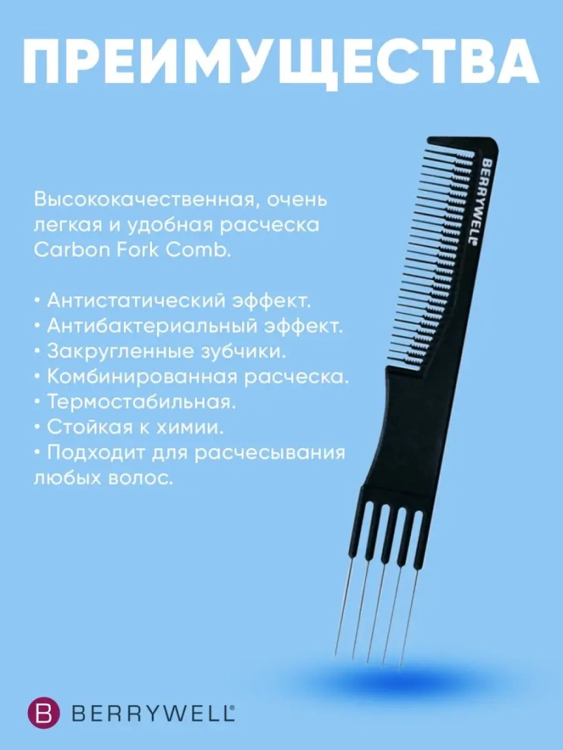 Высококачественная, очень легкая и удобная расческа Carbon Fork Comb. Антистатический эффект. Антибактериальный эффект. Закругленные зубчики. Комбинированная расческа. Термостабильная. Стойкая к химии. Подходит для расчесывания любых волос.