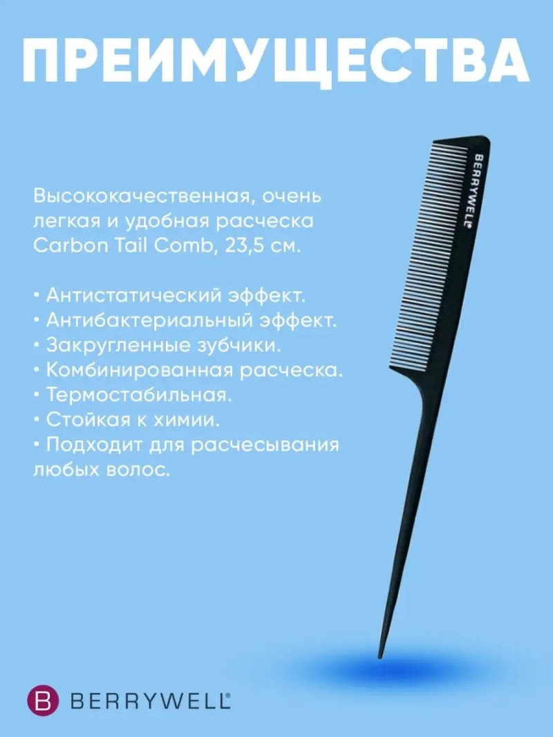 Высококачественная, очень легкая и удобная расческа Carbon Tail Comb, 23,5 см. Антистатический эффект. Антибактериальный эффект. Закругленные зубчики. Комбинированная расческа. Термостабильная. Стойкая к химии. Подходит для расчесывания любых волос.