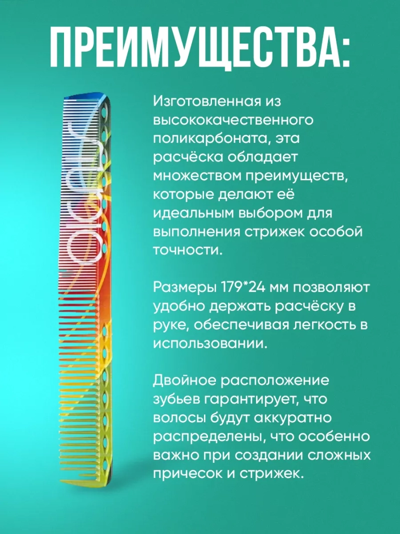 Расческа парикмахерская 179*24 мм – это незаменимый инструмент для профессиональных парикмахеров и любителей, стремящихся к идеальной стрижке. Изготовленная из высококачественного поликарбоната, эта расчёска обладает множеством преимуществ, которые делают её идеальным выбором для выполнения стрижек особой точности. Размеры 179*24 мм позволяют удобно держать расчёску в руке, обеспечивая легкость в использовании. Двойное расположение зубьев гарантирует, что волосы будут аккуратно распределены, что особенно важно при создании сложных причесок и стрижек. Ровная основа расчёски обеспечивает стабильность и точность на каждом этапе работы, позволяя парикмахеру добиться превосходных результатов. Состав расчёски – 100% поликарбонат, что делает её не только легкой, но и прочной. Этот материал устойчив к воздействию химических веществ, что позволяет использовать расчёску в сочетании с различными стайлинговыми средствами. Кроме того, поликарбонат легко очищается, что обеспечивает гигиеничность инструмента и продлевает его срок службы. Расческа парикмахерская 179*24 мм станет отличным дополнением любого парикмахерского арсенала. Она идеально подходит как для профессионалов, так и для домашнего использования. Если вы ищете инструмент, который поможет вам создать прическу вашей мечты или выполнить стрижку с максимальной точностью, эта расчёска станет вашим надежным помощником. Не упустите возможность оценить все преимущества расчёски парикмахерской 179*24 мм и сделайте свои стрижки ещё более качественными и стильными.
