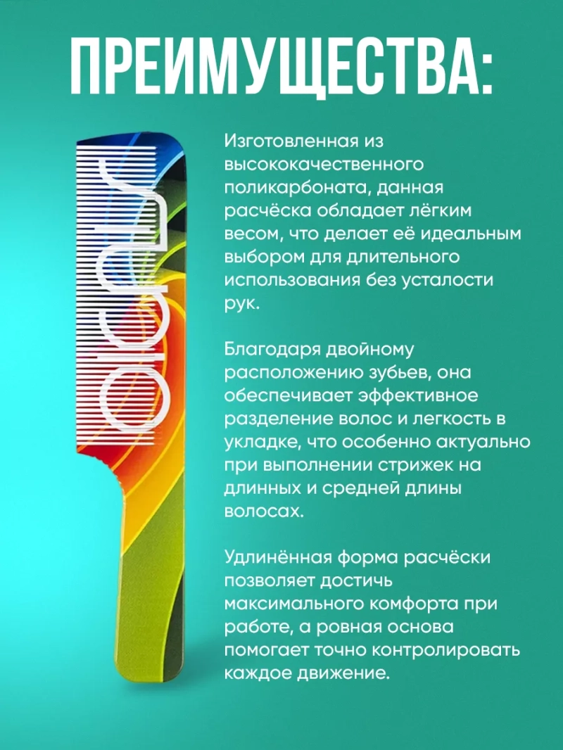 Расческа парикмахерская c ручкой 209*42 мм – это незаменимый инструмент для профессионалов и любителей парикмахерского искусства. Изготовленная из высококачественного поликарбоната, данная расчёска обладает лёгким весом, что делает её идеальным выбором для длительного использования без усталости рук. Благодаря двойному расположению зубьев, она обеспечивает эффективное разделение волос и легкость в укладке, что особенно актуально при выполнении стрижек на длинных и средней длины волосах. Удлинённая форма расчёски позволяет достичь максимального комфорта при работе, а ровная основа помогает точно контролировать каждое движение. Это особенно важно для парикмахеров, стремящихся к идеальному результату. Расческа парикмахерская c ручкой 209*42 мм станет вашим надёжным помощником в создании стильных и аккуратных причесок. Эта расчёска прекрасно подходит как для профессиональных парикмахеров, так и для домашнего использования. С её помощью вы сможете не только стригать, но и укладывать волосы, создавая разнообразные образы. Она легко очищается и не требует особого ухода, что делает её ещё более привлекательной для покупателей. Покупая расчёску парикмахерскую c ручкой 209*42 мм, вы получаете не просто инструмент, а настоящего помощника в мире стиля и красоты. Не упустите возможность улучшить свой арсенал парикмахерских принадлежностей и сделайте выбор в пользу качества и удобства!