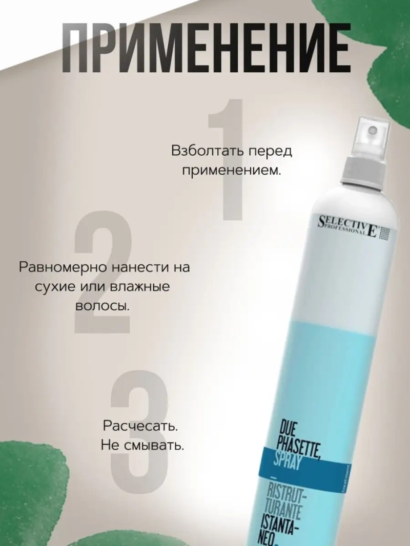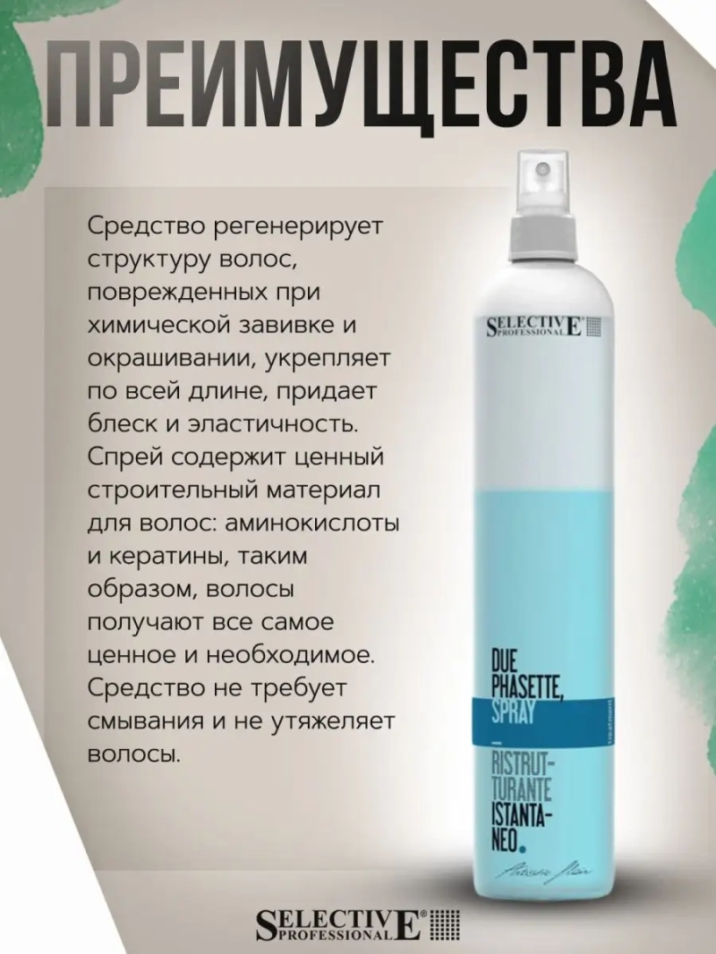 Selective Professional Artistic Flair Due Phasette spray Регенерирующее средство для волос мгновенного действия, 450 мл, спрей. Due Phasette - Регенерирующее средство мгновенного действия Спрей - кондиционер Selective Due Phasette выполняет мгновенное кондиционирующее действие на кутикулу и волокно волоса. Идеальное средство для ухода за волосами после химической завивки и окрашивания волос. Придает волосам блеск и объем. Устраняет электростатический эффект. Selective Due Phasette восстанавливает физиологический рН обработанных волос, облегчает их расчесывание. Не требует смывания. Содержит аминокислоты кератина и провитамин B5. Эффект: антистатик, восстановление, облегчение расчесывания, придание блеска, придание объема, увлажнение, укрепление. Способ применения:;взболтать перед применением. Равномерно нанести на сухие или влажные волосы, расчесать. Не смывать.