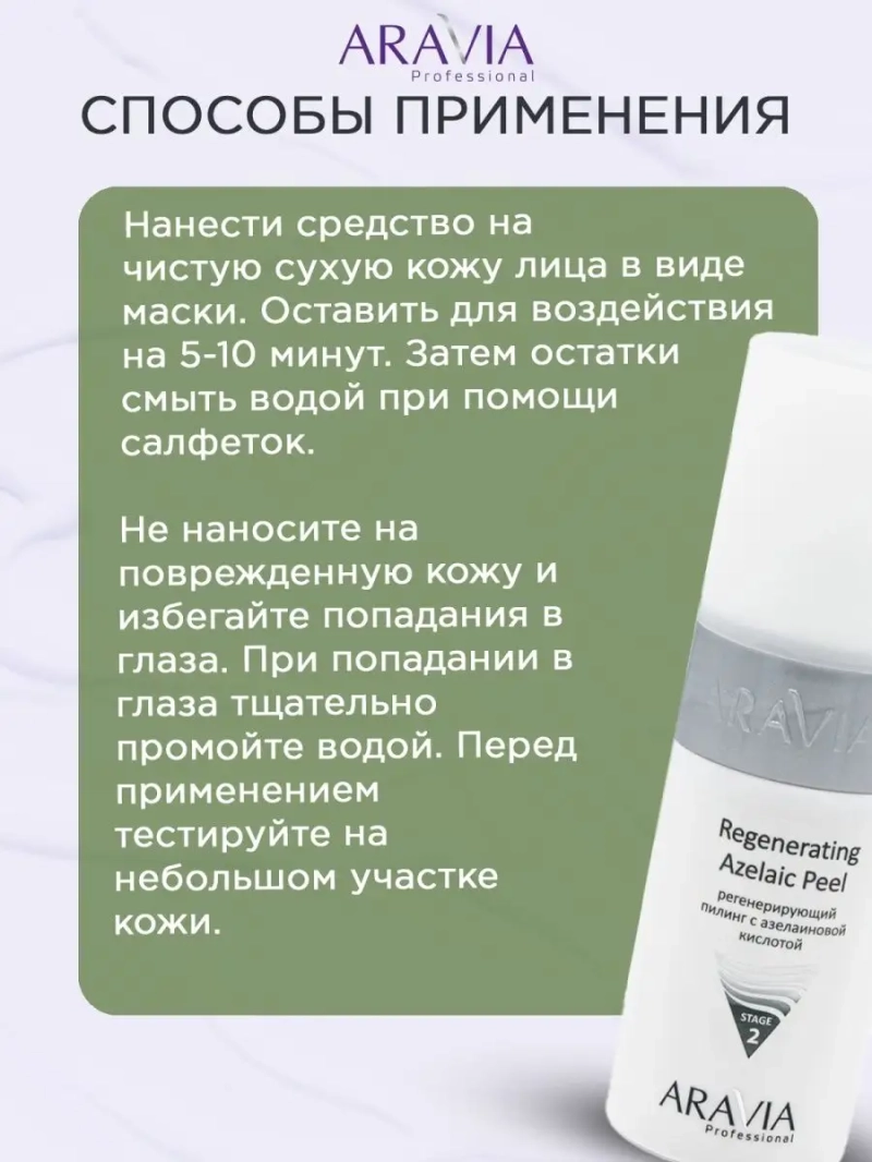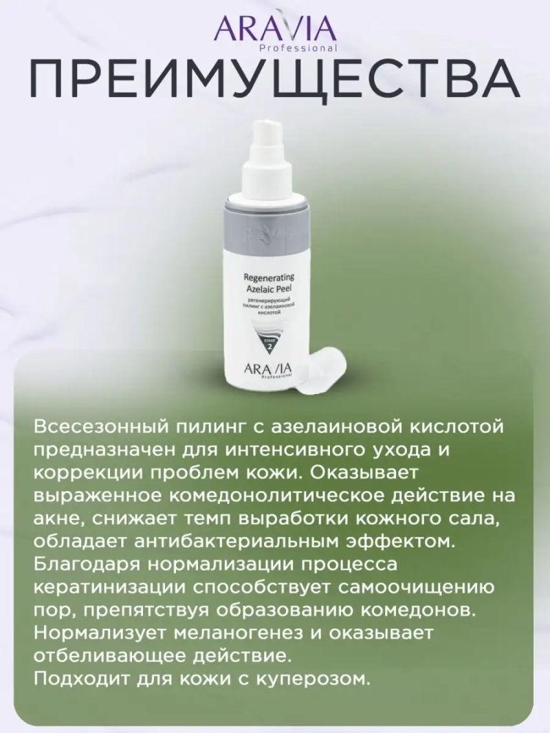 РЕГЕНЕРИРУЮЩИЙ ПИЛИНГ С АЗЕЛАИНОВОЙ КИСЛОТОЙ REGENERATING AZELAIC, 150 МЛ. Пилинг с азелаиновой кислотой предназначен для интенсивного ухода и коррекции проблем кожи. Оказывает выраженное комедонолитическое действие на акне, снижает темп выработки кожного сала, обладает антибактериальным эффектом. Благодаря нормализации процесса кератинизации способствует самоочищению пор, препятствуя образованию комедонов. Нормализует меланогенез и оказывает отбеливающее действие. Особенности: подходит для кожи с куперозом. Назначение: интенсивный уход за кожей в рамках профессиональных процедур. Глубокое очищение, пилинг, снятие гиперкератоза, нормализация деятельности сальных желёз, анти-акне эффект, профилактика гиперпигментации. Рекомендации для использования: Профессиональный уход: применять на этапе глубокого очищения, пилинга, подготовки кожи к интенсивному уходу. ДЕЙСТВИЕ: Комедонолитическое, Кератолитическое, Осветляющее, Себорегулирующее. Биоактивный состав: азелаиновая кислота, гликолевая кислота, аллантоин. Состав продукта (INCI): Aqua, Isopentyldiol, Polyquaternium-37, Azelaic acid, Glycolic acid, Triethanolamine, Allantoin, Phenoxyethanol (and) Ethylhexylglycerin, Parfum. СПОСОБ ПРИМЕННЕНИЯ: Нанести средство на чистую сухую кожу лица в виде маски. Оставить для воздействия на 5-10 минут. Затем остатки смыть водой при помощи салфеток. Меры предосторожности: не наносите на поврежденную кожу и избегайте попадания в глаза. При попадании в глаза тщательно промойте водой. Перед применением тестируйте на небольшом участке кожи.
