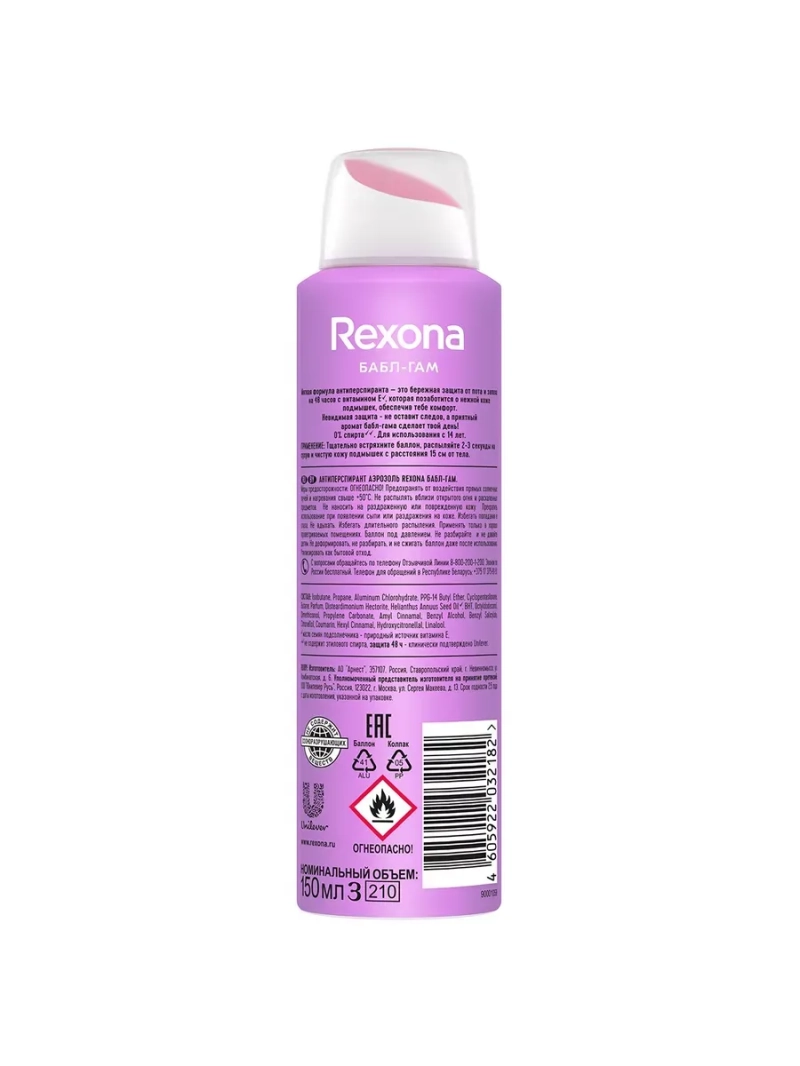 Полное наименование: REXONA / Рексона Антиперспирант аэрозоль бабл-гам 150мл. Производитель: Unilever Россия. Открой для себя защиту от пота и запаха до 48 часов' и невероятный аромат с антиперспирантом-аэрозолем Бабл-гам. Невидимая защита не оставит никаких следов, а дерзкий аромат бабл-гам будет напоминать о том, что в твоей жизни – твои правила. Формула с витамином Е* позаботится о коже, обеспечивая тебе максимальный** комфорт. Рекомендован для использования с 14 лет. ' защита 48 ч - клинически подтверждено Юнилевер. * масло семян подсолнечника - природный источник витамина Е. ** в линейке Rexona.