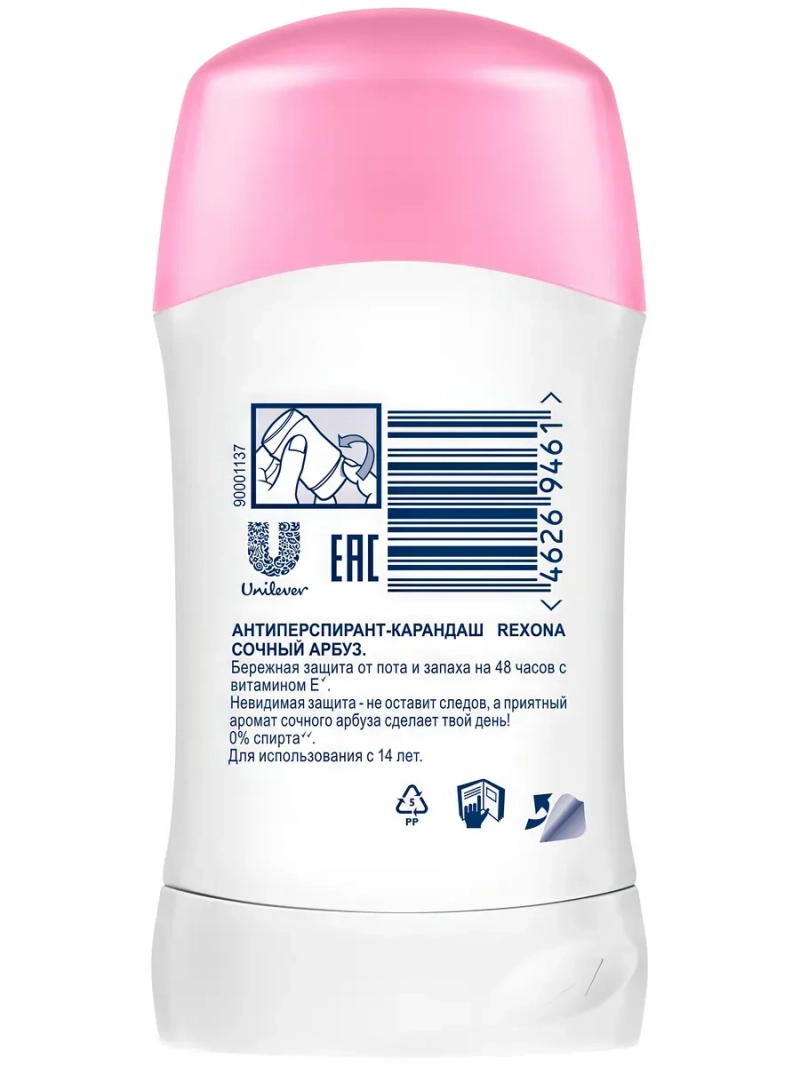 Полное наименование: REXONA/Рексона Антиперспирант-карандаш сочный арбуз 40мл. Производитель: Unilever Россия. Открой для себя бескомпромиссную защиту от пота и запаха до 48 часов' с антиперспирантом-карандашом. Невидимая защита не оставит видимых следов, а бодрящий аромат подарит заряд свежести на весь день. Формула с витамином Е* позаботится о коже, обеспечивая тебе максимальный** комфорт. Подходит для использования с 14 лет. ' защита 48 ч - клинически подтверждено Юнилевер. * масло семян подсолнечника - природный источник витамина Е. ** в линейке Rexona.