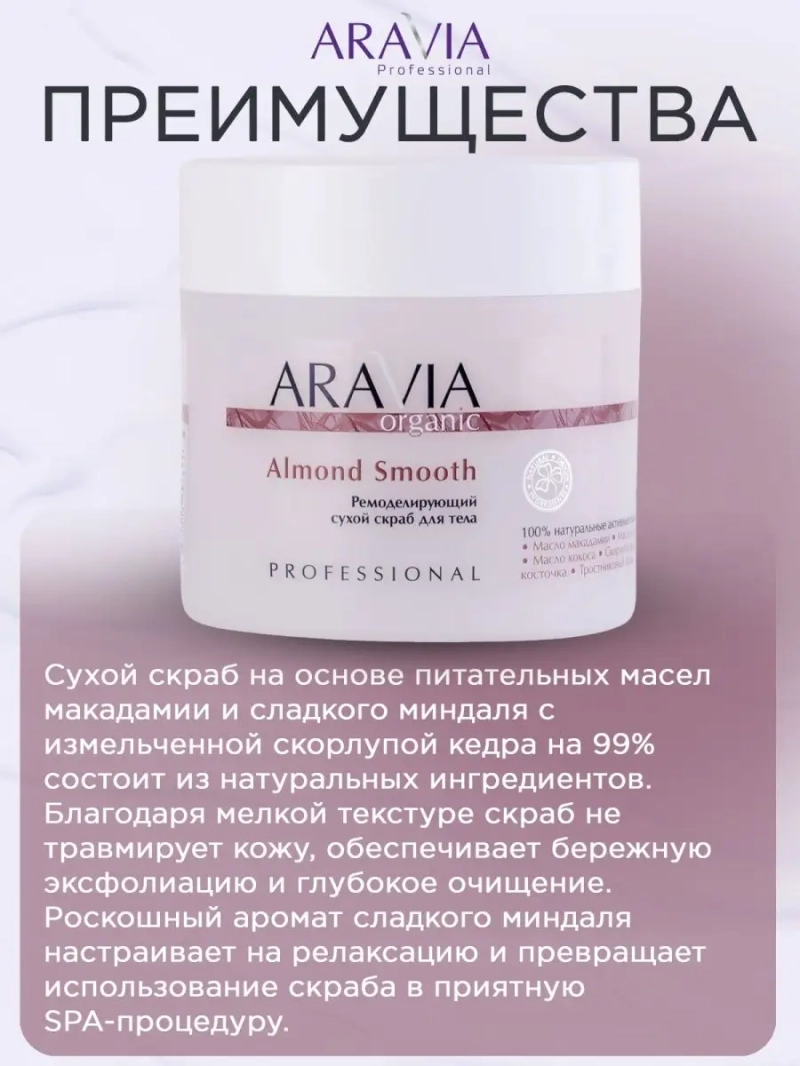 РЕМОДЕЛИРУЮЩИЙ СУХОЙ СКРАБ ДЛЯ ТЕЛА ALMOND SMOOTH, 300 МЛ. Сухой скраб на основе питательных масел макадамии и сладкого миндаля с измельченной скорлупой кедра на 99% состоит из натуральных ингредиентов. Благодаря мелкой текстуре скраб не травмирует кожу, обеспечивает бережную эксфолиацию и глубокое очищение. Роскошный аромат сладкого миндаля настраивает на релаксацию и превращает использование скраба в приятную SPA-процедуру. Назначение: программы похудения, антицеллюлитные процедуры, подготовка к обёртыванию, лифтинг и тонус кожи. Рекомендации для использования: Профессиональный уход: этап подготовки и очищения салонной процедуры. Домашний уход: 1-2 раза в неделю. ДЕЙСТВИЕ: антицеллюлитное, массажное, тонизирующее, очищающее. Биоактивный состав: сахар, морская соль, масло кокоса, масло сои, масло абрикоса, масло миндаля, масло макадамии, абразив кедровой косточки, витамин Е, сквалан. Состав продукта (INCI): Sucrose, Sodium Chloride, Cocos Nucifera (Coconut) Oil, Glycine Soja (Soybean) Oil, Prunus Armeniaca (Apricot) Kernel Powder, Prunus Amygdalus Dulcis (Sweet Almond) Oil, Macadamia Ternifolia Seed Oil, Pinus Sibirica Shell Powder, Tocopheryl Acetate, Tocopherol, Beta-Sitosterol, Squalene, Parfum. СПОСОБ ПРИМЕНЕНИЯ: Нанести скраб на влажную кожу, тщательно помассировать массажными движениями в течение 2-3 минут, оставить скраб на одну минуту. Тщательно смыть водой. Для улучшения скольжения в профессиональной процедуре рекомендуется добавить в скраб массажное масло. Меры предосторожности: не наносить на слизистую. С осторожностью использовать на зоне живота и внутренней поверхности бедер. Избегать попадания в глаза и не наносить на поврежденную кожу. Перед применением тестировать на небольшом участке кожи.