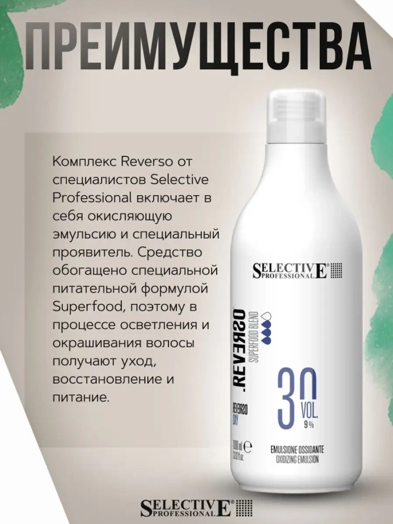Эмульсия окисляющая "REVERSO OXY" 9% (20vol) 1000 мл. Эмульсия окисляющая REVERSO OXY и специальный проявитель REVERSO REVEALER, обогащенные эксклюзивной фреш-смесью Superfood, созданы для получения наилучших результатов при синергичном использовании с крем-краской REVERSO для перманентного и полуперманентного окрашивания соответственно. Способ применения:;Перманентное окрашивание. Эмульсия окисляющая REVERSO OXY 9%. Смесь: 1:1, 1:2 для суперосветляющей серии. Время выдержки: 30 мин, 45 мин для суперосветляющей серии. Состав: aqua, cetearyl alcohol, hydrogen peroxide, ceteareth-30, parfum, zingiber officinale root juice, octyldodecanol, capsicum annuum fruit juice, pyrus malus juice, vaccinium angustifolium fruit juice, persea gratissima fruit extract, dipotassium phosphate, rubus idaeus juice, rubus fruticosus juice, etidronic acid, curcuma longa root extract, musa paradisiaca fruit juice, salicylic acid, hexyl cinnamal, linalool, citronellol, sodium stannate, daucus carota sativa root juice, citrus aurantium dulcis juice.