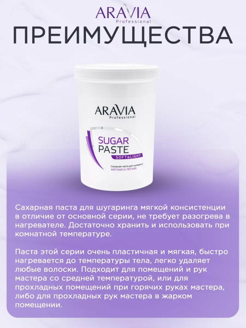 ПАСТА ДЛЯ ШУГАРИНГА «МЯГКАЯ И ЛЕГКАЯ», 1500 Г. Сахарная паста для шугаринга мягкой консистенции в отличие от основной серии, не требует разогрева в нагревателе. Достаточно хранить и использовать при комнатной температуре. Паста этой серии очень пластичная и мягкая, быстро нагревается до температуры тела, легко удаляет любые волоски. Подходит для помещений и рук мастера со средней температурой, или для прохладных помещений при горячих руках мастера, либо для прохладных рук мастера в жарком помещении. Обеспечивает легкое нанесение и отличное сцепление, эффективно удаляет нежелательные волосы. СПОСОБ ПРИМЕНЕНИЯ: Обезжирить кожу с помощью лосьона или геля. Для улучшения сцепления с волосом нанести тальк. Разогреть пасту в нагревателе до температуры 27-28 °C. Провести процедуру депиляции. Снять остатки пасты косметической минерализованной водой. Завершить процедуру питательными сливками.