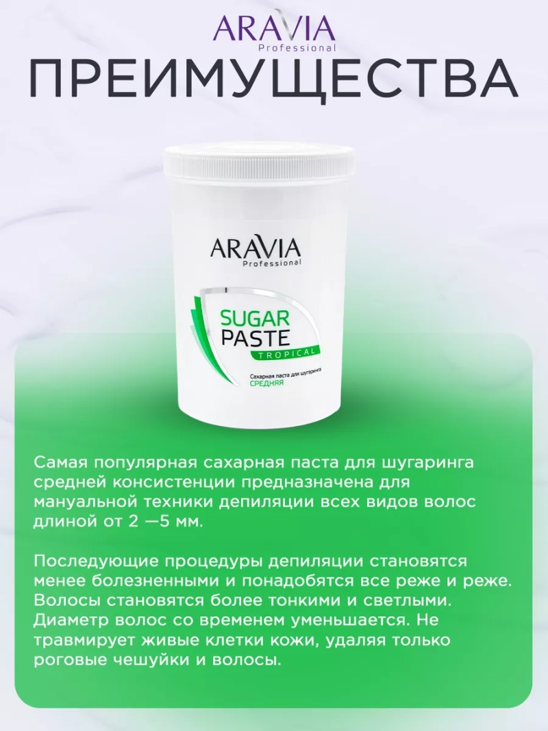 ПАСТА ДЛЯ ШУГАРИНГА «ТРОПИЧЕСКАЯ», 1500 Г. Самая популярная сахарная паста для шугаринга средней консистенции предназначена для мануальной техники депиляции всех видов волос длиной от 2 —5 мм. Последующие процедуры депиляции становятся менее болезненными и понадобятся все реже и реже. Волосы становятся более тонкими и светлыми. Диаметр волос со временем уменьшается. Не травмирует живые клетки кожи, удаляя только роговые чешуйки и волосы. СПОСОБ ПРИМЕНЕНИЯ: Обезжирить кожу с помощью лосьона или геля. Для улучшения сцепления с волосом нанести тальк.Разогреть пасту в нагревателе до температуры 37-40 °C. Провести процедуру депиляции. Снять остатки пасты косметической минерализованной водой. Завершить процедуру питательными сливками. Меры предосторожности: не наносите на поврежденную кожу и избегайте попадания в глаза. При попадании в глаза тщательно промойте водой. Перед применением тестируйте на небольшом участке кожи.