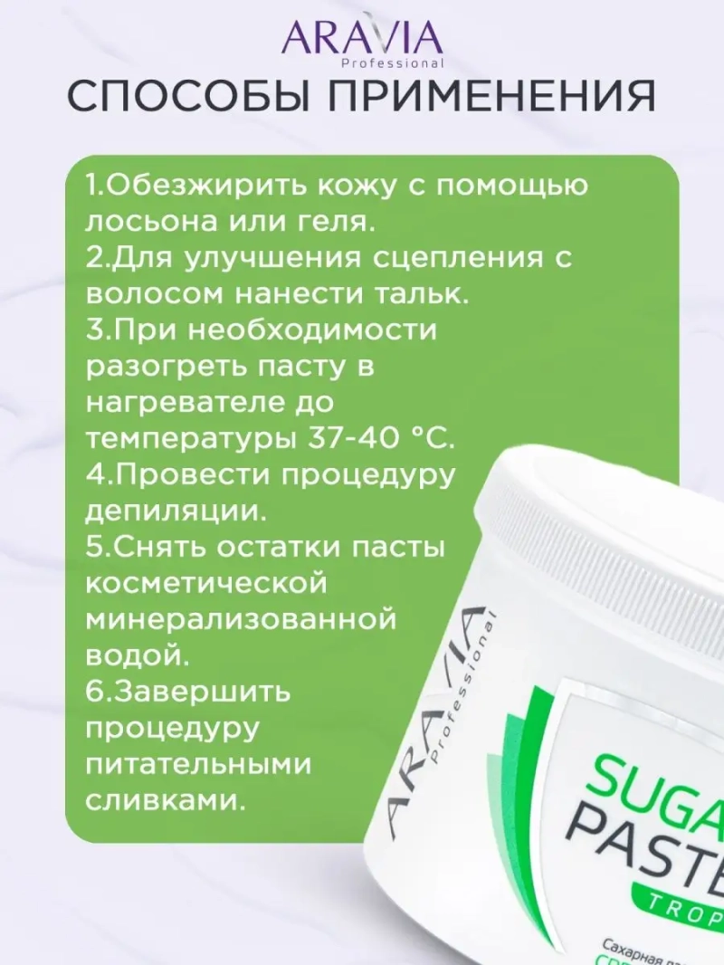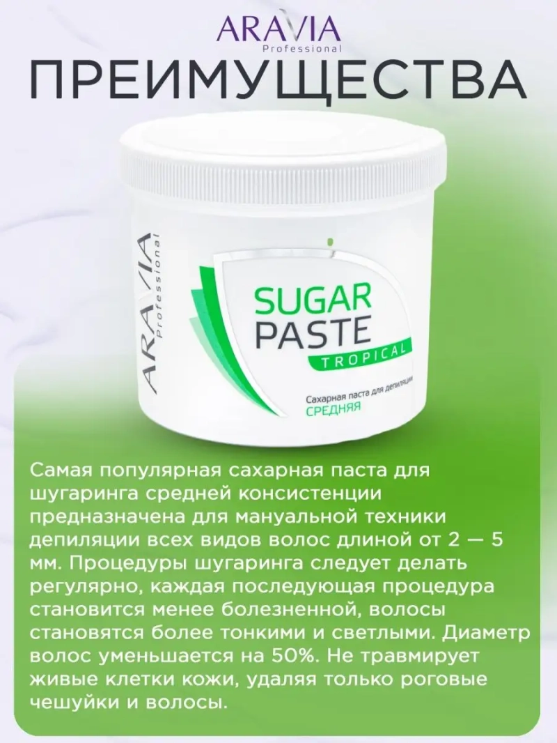 ПАСТА ДЛЯ ШУГАРИНГА «ТРОПИЧЕСКАЯ», 750 Г. Самая популярная сахарная паста для шугаринга средней консистенции предназначена для мануальной техники депиляции всех видов волос длиной от 2 — 5 мм. Процедуры шугаринга следует делать регулярно, каждая последующая процедура становится менее болезненной, волосы становятся более тонкими и светлыми. Диаметр волос уменьшается на 50%. Не травмирует живые клетки кожи, удаляя только роговые чешуйки и волосы. Назначение: удаление нежелательных волос. Рекомендации для использования: для профессионального использования.