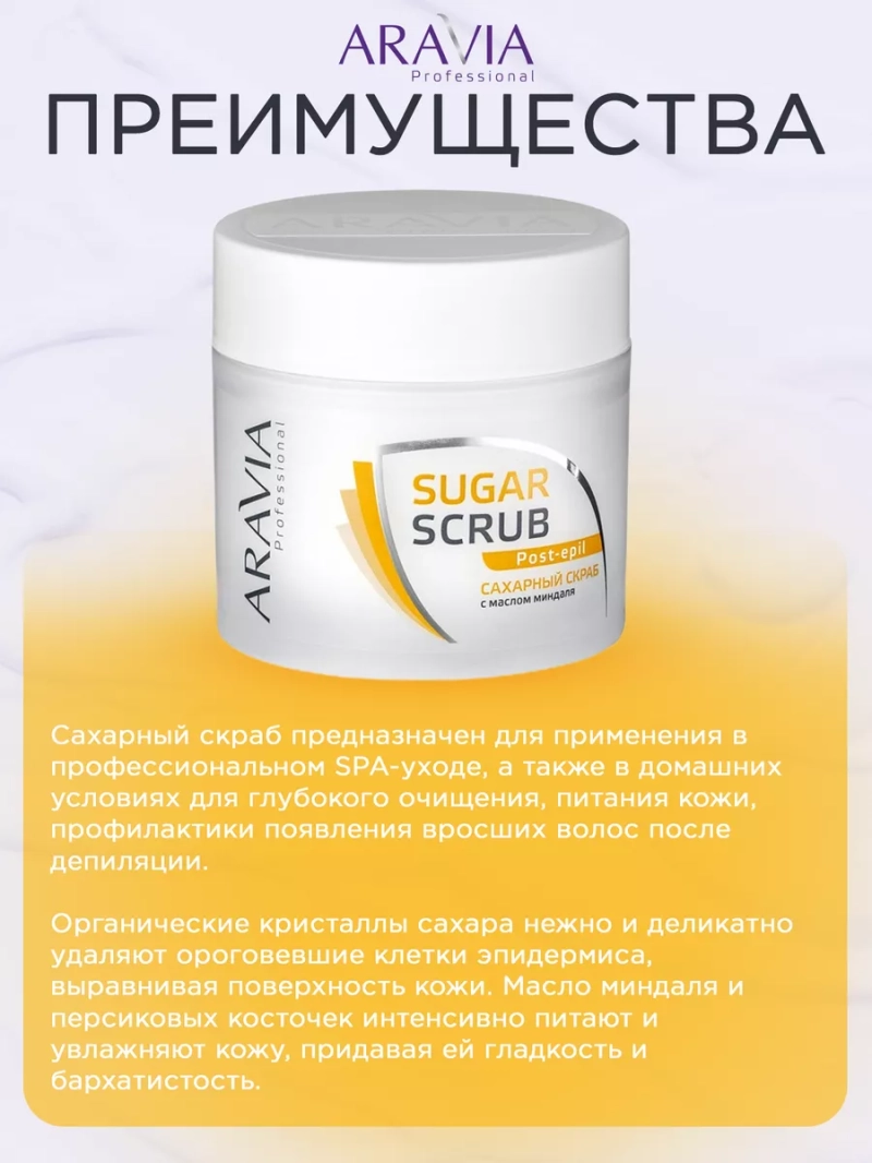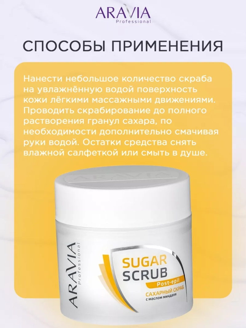 СКРАБ САХАРНЫЙ С МАСЛОМ МИНДАЛЯ ДЛЯ ТЕЛА, 300 МЛ. Сахарный скраб предназначен для применения в профессиональном SPA-уходе, а также в домашних условиях для глубокого очищения, питания кожи, профилактики появления вросших волос после депиляции. Органические кристаллы сахара нежно и деликатно удаляют ороговевшие клетки эпидермиса, выравнивая поверхность кожи. Масло миндаля и персиковых косточек интенсивно питают и увлажняют кожу, придавая ей гладкость и бархатистость. Масло ши и витамин Е восстанавливают защитный барьер кожи, позволяющий надолго сохранить уровень естественной увлажненности кожи. Назначение: межкурсовой уход между процедурами депиляции. Биоактивный состав: экстракт косточки персика, масло миндаля, масло ши. Состав продукта (INCI): Sucrose, Sunflower Seed Oil, Prunus Persica (Peach) Kernel Oil, Prunus Amygdalus Dulcis Oil, Beeswax, Butyrospermum Parkii (Shea Butter), BHT, Tocopheryl Acetate, Parfum. СПОСОБ ПРИМЕНЕНИЯ: Нанести небольшое количество скраба на увлажненную водой поверхность кожи легкими массажными движениями. Проводить скрабирование до полного растворения гранул сахара, по необходимости дополнительно смачивая руки водой. Остатки средства смыть водой. Меры предосторожности: не наносите на поврежденную кожу и избегайте попадания в глаза. При попадании в глаза тщательно промойте водой. Перед применением тестируйте на небольшом участке кожи.