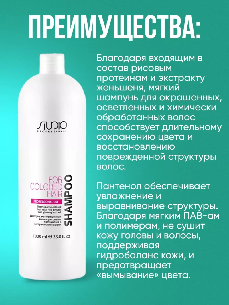 Шампунь для окрашенных волос благодаря входящим в состав рисовым протеинам и экстракту женьшеня, мягкий шампунь способствует длительному сохранению цвета и восстановлению поврежденной структуры волос. Пантенол обеспечивает увлажнение и выравнивание структуры. Благодаря мягким ПАВ-ам и полимерам, не сушит кожу головы и волосы, поддерживая гидробаланс кожи, и предотвращает вымывание цвета.... Шампунь для окрашенных волос благодаря входящим в состав рисовым протеинам и экстракту женьшеня, мягкий шампунь способствует длительному сохранению цвета и восстановлению поврежденной структуры волос. Пантенол обеспечивает увлажнение и выравнивание структуры. Благодаря мягким ПАВ-ам и полимерам, не сушит кожу головы и волосы, поддерживая гидробаланс кожи, и предотвращает вымывание цвета. УФ-фильтры обеспечивают защиту от воздействия солнечных лучей. Состав: AQUA [WATER], SODIUM LAURETH SULFATE, SODIUM CHLORIDE, COCAMIDOPROPYL BETAINE, PARFUM [FRAGRANCE], IMIDAZOLIDINYL UREA, TETRASODIUM EDTA, CITRIC ACID, PROPYLENE GLYCOL, BENZOPHENONE-4, POLYQUATERNIUM-7, PANTHENOL, HYDROLYZED RICE PROTEIN, PANAX GINSENG ROOT EXTRACT, CI 16035 [RED 40] Способ применения: Необходимое количество шампуня нанести на влажные волосы, вспенить и мягко массировать в течение 3-6 минут. Смыть обильным количеством воды. При необходимости повторить. Для завершения процесса мытья волос используйте бальзам для окрашенных волос с рисовыми протеинами и экстрактом женьшеня линии Studio Professional.