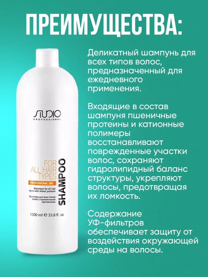 Шампунь для всех типов волос с пшеничными протеинами - деликатный шампунь для всех типов волос, предназначенный для ежедневного применения. Входящие в состав шампуня пшеничные протеины и катионные полимеры восстанавливают поврежденные участки волос, сохраняют гидролипидный баланс структуры, укрепляют волосы, предотвращая их ломкость. Содержание УФ-фильтров обеспечивает защиту от воздействия... Шампунь для всех типов волос с пшеничными протеинами - деликатный шампунь для всех типов волос, предназначенный для ежедневного применения. Входящие в состав шампуня пшеничные протеины и катионные полимеры восстанавливают поврежденные участки волос, сохраняют гидролипидный баланс структуры, укрепляют волосы, предотвращая их ломкость. Содержание УФ-фильтров обеспечивает защиту от воздействия окружающей среды на волосы. Способ применения: Необходимое количество шампуня нанести на влажные волосы, вспенить и мягко массировать в течение 3-6 минут. Смыть обильным количеством воды. При необходимости повторить. Для завершения процесса мытья волос используйте бальзам для всех типов волос с пшеничными протеинами линии Studio Professional. Рейтинг: Товар занимает 10 место в рейтинге укрепляющих шампуней для волос 2023 года