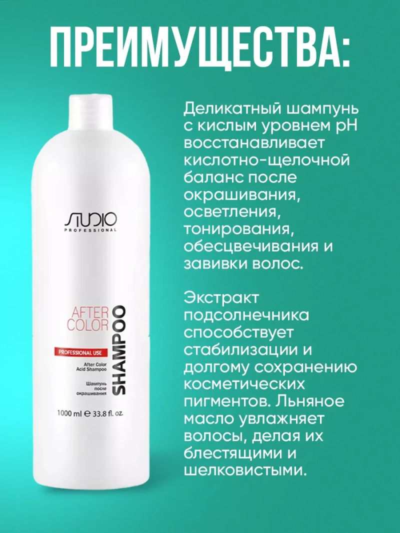 Kapous Professional Шампунь после окрашивания волос, 1000 мл Капус Деликатный шампунь с кислым уровнем рН восстанавливает кислотно-щелочной баланс после окрашивания, осветления, тонирования, обесцвечивания и завивки волос. Экстракт подсолнечника способствует стабилизации и долгому сохранению косметических пигментов. Льняное масло увлажняет волосы, делая их блестящими и шелковистыми. Необходимое количество шампуня нанести на влажные волосы, вспенить и мягко массировать в течение 1-3 минут. Смыть обильным количеством воды. При необходимости повторить. Для завершения процесса мытья волос используйте бальзам после окрашивания волос After Color Balsam.