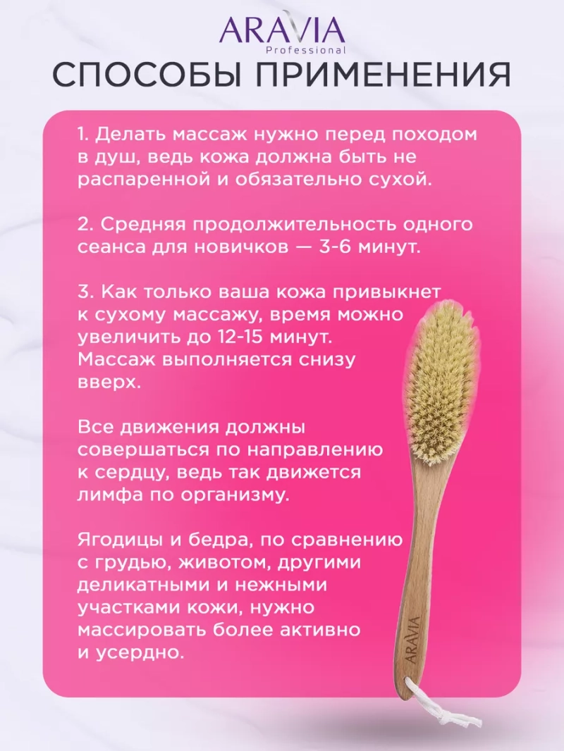 ЩЕТКА ДЛЯ СУХОГО МАССАЖА, НАТУРАЛЬНОЕ ВОЛОКНО, СРЕДНЯЯ. Щетка предназначена для проведения сухого массажа тела. Применение щетки способствует отшелушиванию омертвевших клеток кожи, улучшает кровообращение и лимфоток. Уже после нескольких сеансов вы сможете увидеть, что кожа становится более гладкой и упругой, а проявления целлюлита становятся менее заметны. Щетка помогает бороться с растяжками, рубцами, шрамами и другими кожными дефектами. Щетка выполнена из древесины бука и натуральной щетины. Внимание! Цвет изделия может отличаться от изображения. Назначение: проведение сухого массажа. Эффект: упругая кожа. Жесткость: средняя. СПОСОБ ПРИМЕНЕНИЯ: 1. Делать массаж нужно перед походом в душ, ведь кожа должна быть не распаренной и обязательно сухой. 2. Средняя продолжительность одного сеанса для новичков — 3-6 минут. 3. Как только ваша кожа привыкнет к сухому массажу, время можно увеличить до 12-15 минут. Массаж выполняется снизу вверх. Все движения должны совершаться по направлению к сердцу, ведь так движется лимфа по организму. Ягодицы и бедра, по сравнению с грудью, животом, другими деликатными и нежными участками кожи, нужно массировать более активно и усердно. После сеанса драйбрашинга кожа должна быть розовой, а не красной! После массажа необходимо сразу же принять душ, который смоет отшелушенные частички кожи. После душа хорошо разотрите кожу махровым полотенцем и нанесите на тело увлажняющее масло, крем или лосьон. Лимфоузлы, кожу внутренней поверхности бедер, зоны под подмышками и коленями массировать нельзя. Делать сухой массаж щеткой в области сердца категорически запрещено! Примечание: не наносить на повреждённую кожу. Противопоказания к проведению массажа сухой щеткой: повреждения целостности эпидермиса: порезы, раны, ссадины, ушибы; воспалительные заболевания, высыпания; дерматит; псориаз; варикоз; родинки, папилломы, невусы; родинки, папилломы, невусы; повышенная температура тела; острая стадия инфекционного заболевания.