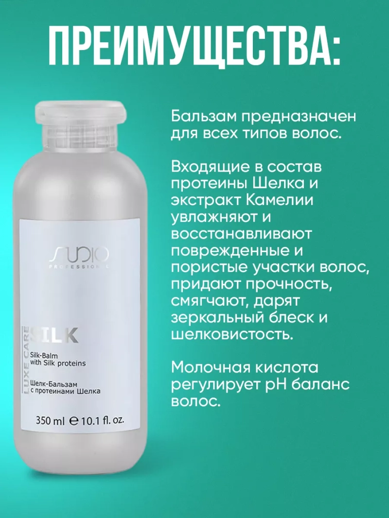 Бальзам с протеинами шелка Шелк Luxe Care предназначен для всех типов волос. Входящие в состав протеины шелка и экстракт камелии увлажняют и восстанавливают поврежденные и пористые участки волос, придают прочность, смягчают, дарят зеркальный блеск и шелковистость. Молочная кислота регулирует pH баланс волос. Бальзам с протеинами шелка Шелк Luxe Care предназначен для всех типов волос. Входящие в состав протеины шелка и экстракт камелии увлажняют и восстанавливают поврежденные и пористые участки волос, придают прочность, смягчают, дарят зеркальный блеск и шелковистость. Молочная кислота регулирует pH баланс волос. Активные ингредиенты: Молочная кислота, протеины шелка, экстракт камелии. Способ применения: После использования Шелк-Шампуня нанести на влажные волосы бальзам. Оставить на 3-5 минут, смыть. Подходит для частого использования.