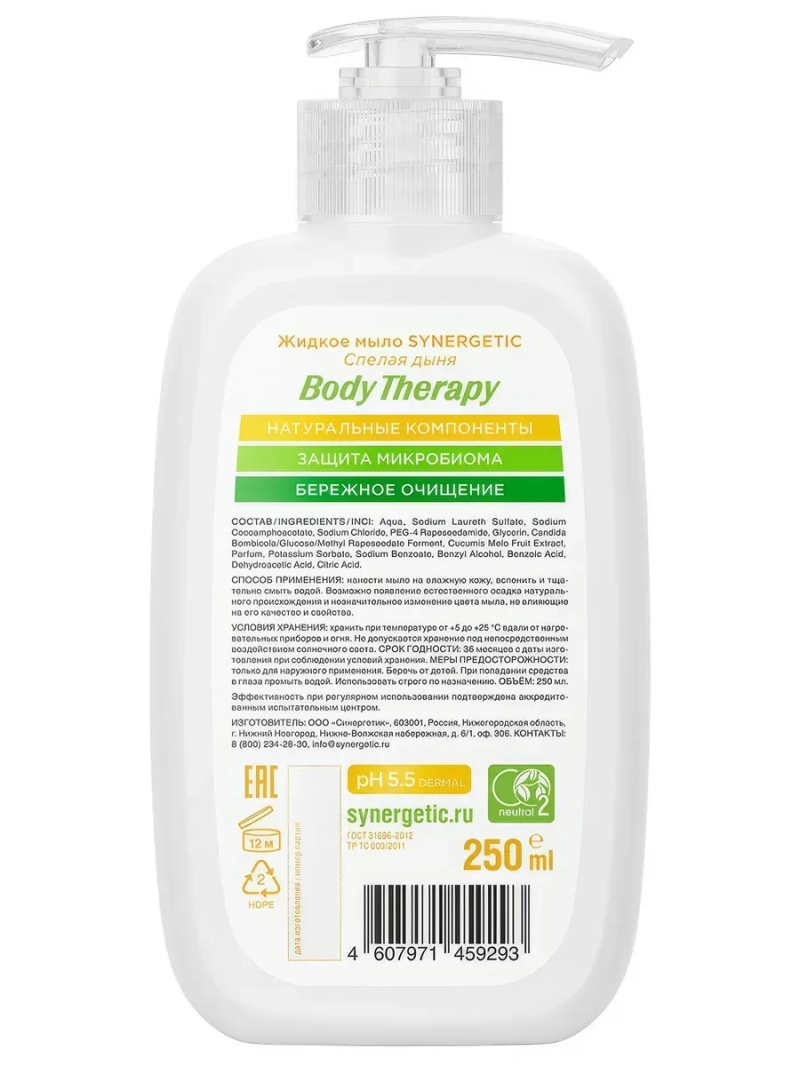 Жидкое мыло SYNERGETIC "Спелая дыня" BODY THERAPY мягко и деликатно очищает кожу и поддерживает ее естественный рН-баланс. Жидкое мыло на основе натуральных компонентов бережно очищает, увлажняет и смягчает кожу, сохраняя оптимальный гидролипидный баланс. Экстракт дыни обладает витаминизирующим действием, питает кожу, защищая ее от стресса и негативного воздействия окружающей среды. Парфюмерная композиция с нотами спелой дыни наполняет энергией и дарит ощущение свежести. Сладкий медовый аромат напоминает о лете, наполненном легкостью, беззаботностью и оптимизмом. Мультифункциональный компонент натурального происхождения софоролипид мягко очищает и сохраняет естественный микробиом кожи. Физиологичный уровень pH 5,5 способствует устранению сухости и гарантирует безопасность при частом использовании средства даже для чувствительной кожи. Эффективность при регулярном использовании подтверждена аккредитованным испытательным центром.
