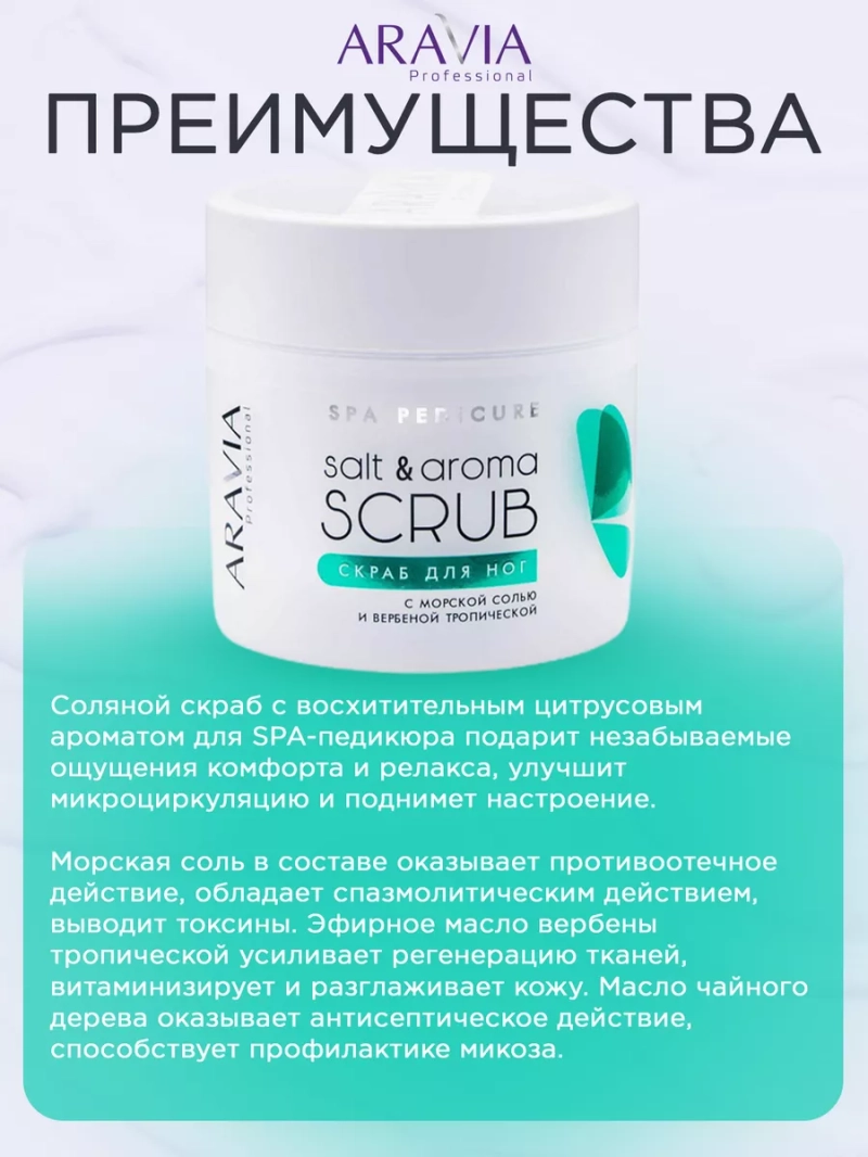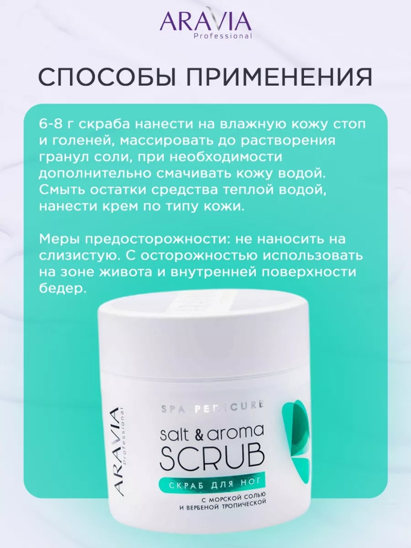 СКРАБ ДЛЯ НОГ С МОРСКОЙ СОЛЬЮ И ВЕРБЕНОЙ ТРОПИЧЕСКОЙ SALT&AROMA SCRUB, 300 МЛ. Соляной скраб с восхитительным цитрусовым ароматом для SPA-педикюра подарит незабываемые ощущения комфорта и релакса, улучшит микроциркуляцию и поднимет настроение. Морская соль в составе оказывает противоотечное действие, обладает спазмолитическим действием, выводит токсины. Эфирное масло вербены тропической усиливает регенерацию тканей, витаминизирует и разглаживает кожу. Масло чайного дерева оказывает антисептическое действие, способствует профилактике микоза. Расслабляющий массаж с соляным скрабом мгновенно снимает усталость и тяжесть в ногах. Кожа становится мягкой и нежной, а эффект от процедуры педикюра более выраженный и продолжительный. Назначение: для процедуры SPA-педикюр, для стоп и голеней. Биоактивный состав: соль морская, масло вербены, масло чайного дерева, масло ши, глицерин. Состав продукта (INCI): Glycerin, Olea Europaea (Olive) Oil, Maris Salt, Butyrospermum Parkii (Shea Butter) Oil, Glyceryl Stearate (and) Ceteareth-20 (and) Ceteareth-12 (and) Cetearyl Alcohol (and) Cetyl Palmitate, Melaleuca Alternifolia (Tea Tree) Leaf Oil, Litsea Cubeba essential oil. СПОСОБ ПРИМЕНЕНИЯ: 6-8 г скраба нанести на влажную кожу стоп и голеней, массировать до растворения гранул соли, при необходимости дополнительно смачивать кожу водой. Смыть остатки средства теплой водой, нанести крем по типу кожи. Меры предосторожности: не наносить на слизистую. С осторожностью использовать на зоне живота и внутренней поверхности бедер. Избегать попадания в глаза и не наносить на поврежденную кожу. Перед применением тестировать на небольшом участке кожи.