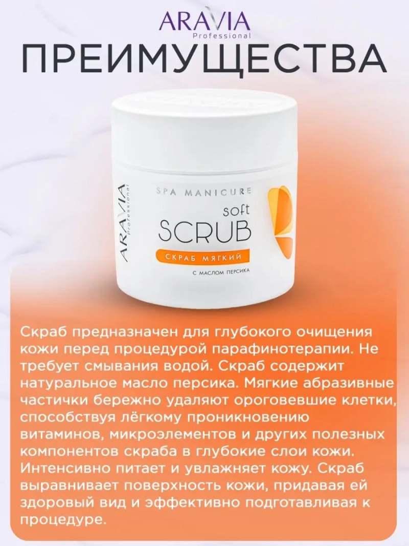 Скраб предназначен для глубокого очищения кожи перед процедурой парафинотерапии. Мягкие абразивные частички скраба бережно удаляют ороговевшие клетки, способствуя легкому проникновению витаминов, микроэлементов и других полезных компонентов скраба в глубокие слои кожи. Масло персика интенсивно питает и увлажняет кожу. Плотная текстура скраба создает на ее поверхности защитную пленку, предохраняющую от воздействия высоких температур. Скраб выравнивает поверхность кожи, придавая ей здоровый вид и эффективно подготавливает к процедуре.Применение: нанести небольшое количество скраба на поверхность кожи легкими массажными движениями. Снять остатки скраба мягкой салфеткой.Активные компоненты: масло персика, масло ши (карите), пчелиный воск, масло сладкого миндаля.