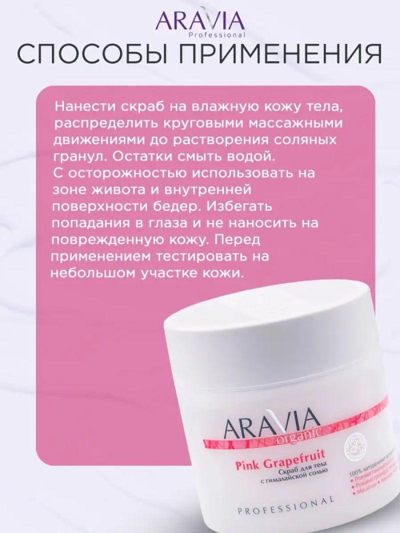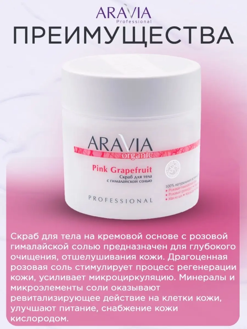 СКРАБ ДЛЯ ТЕЛА С ГИМАЛАЙСКОЙ СОЛЬЮ PINK GRAPEFRUIT, 300 МЛ. Скраб для тела на кремовой основе с розовой гималайской солью предназначен для глубокого очищения, отшелушивания кожи. Драгоценная розовая соль стимулирует процесс регенерации кожи, усиливает микроциркуляцию. Минералы и микроэлементы соли оказывают ревитализирующее действие на клетки кожи, улучшают питание, снабжение кожи кислородом. Экстракт розового грейпфрута оказывает антицеллюлитное действие. Натуральные масла ши и сои значительно улучшают состояние кожного покрова, предотвращают появление сухости, обеспечивая гладкость, эластичность и упругость. Назначение: глубокое очищение кожи тела, антицеллюлитное действие. Возможно применение в домашних условиях. Рекомендации для использования: Профессиональный уход: на этапе глубокого очищения кожи тела. Домашний уход: 1-2 раза в неделю. При выраженном гиперкератозе и себорее возможно ежедневное применение курсом до 1 месяца по назначению косметологом. Биоактивный состав: розовая гималайская соль, розовый грейпфрут (экстракт), морская соль, масло ши, апельсин (экстракт). Состав продукта (INCI): Glycerin, Himalayan pink salt, Sea Salt, Butyrospermum Parkii (Shea Butter) Oil, Glycine Soja (Soybean) Oil, Glyceryl Stearate, Ceteareth-20, Ceteareth-12, Cetearyl Alcohol, Cetyl Palmitate, Сitrus sinensis Extract, Citrus grandis Extract, Parfum. СПОСОБ ПРИМЕНЕНИЯ: Нанести скраб на влажную кожу тела, распределить круговыми массажными движениями до растворения соляных гранул. Остатки смыть водой. Меры предосторожности: не наносить на слизистую. С осторожностью использовать на зоне живота и внутренней поверхности бедер. Избегать попадания в глаза и не наносить на поврежденную кожу. Перед применением тестировать на небольшом участке кожи.