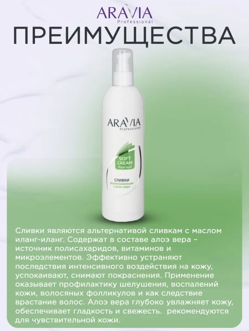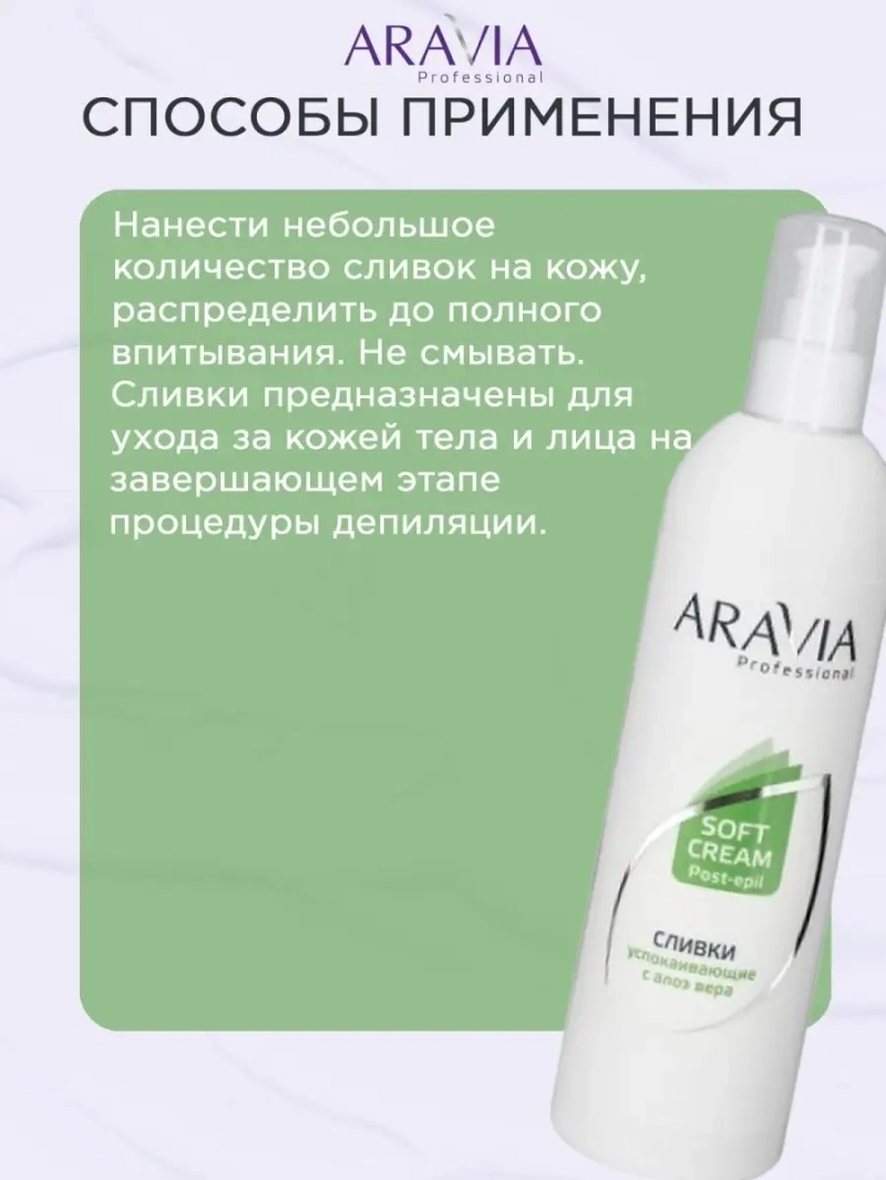 СЛИВКИ УСПОКАИВАЮЩИЕ С АЛОЭ ВЕРА, 300 МЛ. Сливки предназначены для ухода за кожей лица и тела на завершающем этапе процедуры депиляции. Сливки содержат в составе алоэ вера — источник полисахаридов, витаминов и микроэлементов. Эффективно устраняют последствия интенсивного воздействия на кожу, успокаивают и снимают покраснения. Применение оказывает профилактику шелушения, воспалений кожи, волосяных фолликулов и как следствие врастание волос. Алоэ вера глубоко увлажняет кожу, обеспечивает гладкость и свежесть. Липидный комплекс на основе масла ши обладает восстанавливающим действием, улучшает эластичность и тургор и цвет кожи, замедляет трансэпидермальную потерю влаги. Сливки рекомендуются для чувствительной кожи. Назначение: завершающий уход лица и тела после процедуры. депиляции. Рекомендации для использования: для профессионального использования. Биоактивный состав: масло ши, алоэ вера. Состав продукта (INCI): Aqua, Mineral Oil, Propylene Glycol, Glyceryl Stearate, Potassium Cetyl Phosphate, Butyrospermum Parkii (Shea Butter), Aloe Vera Gel, Sodium Polyacrylate, Allantoin, BHT, Phenoxyethanol, Methyl Paraben (and) Ethyl Paraben (and) Propyl Paraben. СПОСОБ ПРИМЕНЕНИЯ: Нанести небольшое количество сливок на кожу, распределить до полного впитывания. Меры предосторожности: не наносите на поврежденную кожу и избегайте попадания в глаза. При попадании в глаза тщательно промойте водой. Перед применением тестируйте на небольшом участке кожи.