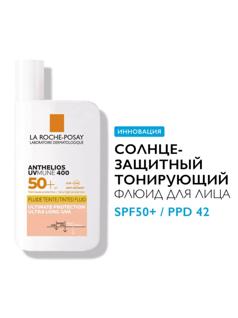 Во время ежедневного пребывания на солнце в городских условиях, а также в условиях повышенной солнечной активности кожа лица нуждается в особой защите, которую может обеспечить солнцезащитный флюид ВВ с тонирующим эффектом для лица ANTHELIOS UVMUNE400 SPF 50 PPD 42. Система безопасных химических и физических фильтров Mexoryl защищает от всех видов лучей и подходит для морского отдыха и ежедневного применения в период активного солнца. Органические фотостабильные фильтры обеспечивают надежную защиту от UVA и UVB лучей и нейтрализуют свободные радикалы. Термальная вода ля рош богата селеном и обладает увлажняющими свойствами. Витамин Е оказывает антиоксидантное действие. Природный минерал перлит абсорбирует влагу и создает визуальный матовый эффект. Усиленная фотостабильность СПФ50 гарантирует высокую степень защиты от ожогов и аллергических реакций и борется с перегревом и пересыханием под солнечными лучами. Выравнивает тон на коже, имеет высокий фактор защиты от ультрафиолета и обеспечивает профилактику новообразований на коже. Водостойкая формула обеспечивает надежную защиту в воде и от пота и защищает от гиперпигментации. Легкая текстура тонирующего флюида обеспечивает равномерное покрытие, быстро впитывается и не оставляет белых следов. Безопасная формула матирующего средства не вызывает раздражения, не закупоривает поры и может использоваться на жирной и проблемной коже. Подходит для кожи вокруг глаз. Не оставляет липкости и не стягивает кожу после впитывания, поэтому подходит для сухой и возрастной кожи. Без отдушек и красителей. Гипоаллергенный санскрин подходит для чувствительной на светлой и смуглой коже. Для всех типов кожи, в том числе кожи, склонной к аллергии и атопии. Некомедогенно. Протестировано под контролем офтальмологов и дерматологов. Встряхнуть перед использованием. Следует наносить непосредственно перед выходом на солнце и обильно повторять после купания и вытирания. Обязательно смывайте солнцезащитное средство с кожи после пребывания на солнце.