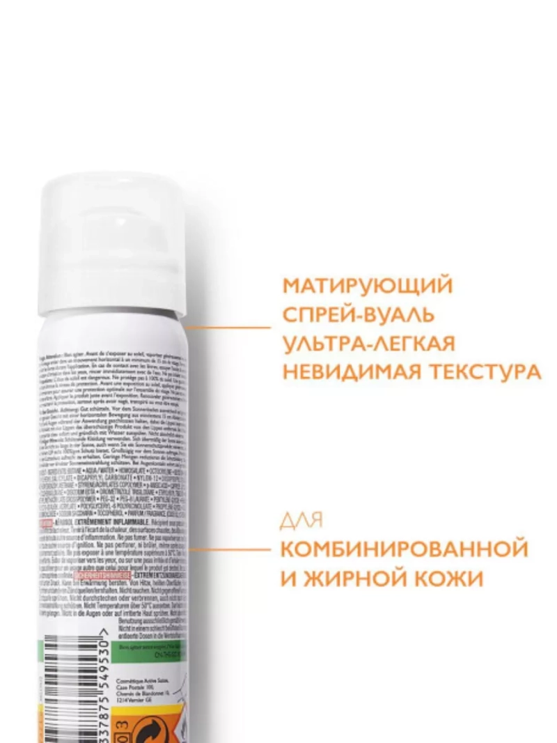 Во время ежедневного пребывания на солнце в городских условиях, а также в условиях повышенной солнечной активности кожа лица нуждается в особой защите, которую может обеспечить матирующий спрей-вуаль для лица Anthelios SPF 50+. Водостойкий спрей SPF 50 от La Roche-Posay PPD 27 с высокой степенью защитного фактора обеспечивает надежную защиту от UV излучения и дополнительный антиоксидантный уход за жирной кожей. Технология XL-Protect, основанная на использовании солнцезащитных фильтров, усиленных антиоксидантами, обеспечивает широкий спектр защиты от UVA и UVB-лучей и нейтрализацию свободных радикалов, предотвращает появление солнечных ожогов и ранних признаков фотостарения. Ключевые ингредиенты термального спрея для лица: термальная вода, витамин Е. Вулканическая термальная вода ля рош с высокой концентрацией селена оказывает защитное, освежающее и увлажняющее действие. Матирующие микрочастицы AIRLICIUM мгновенно тают на коже и контролируют источники блеска, такие как кожный жир и пот. Витамин E мощный антиоксидант защищает жирную кожу от оксидативного стресса и помогает предотвратить появление пигментных пятен. Подходит для использования под макияжем, либо поверх него. Солнцезащитный крем от солнца легко наноситься на сухую кожу прозрачной дымкой, быстро впитывается и не оставляет белых разводов, не создает ощущения липкости. Безопасная формула матирующего средства не вызывает раздражения и может использоваться на жирной и проблемной коже. Увлажняющий спрей СПФ 50 против ожогов поможет защитить чувствительную кожу. Наносите водостойкую солнцезащитную пенку на сухую кожу непосредственно перед выходом на солнце. Не распыляйте спрей непосредственно на лицо, нанесите на ладони и распределите по коже лица, избегая зоны вокруг глаз. Без отдушек и красителей. Гипоаллергенный санскрин подходит для чувствительной на светлой и смуглой коже. Для всех типов кожи, в том числе кожи, склонной к аллергии. Формула протестирована под контролем дерматологов, является гипоаллергенной.