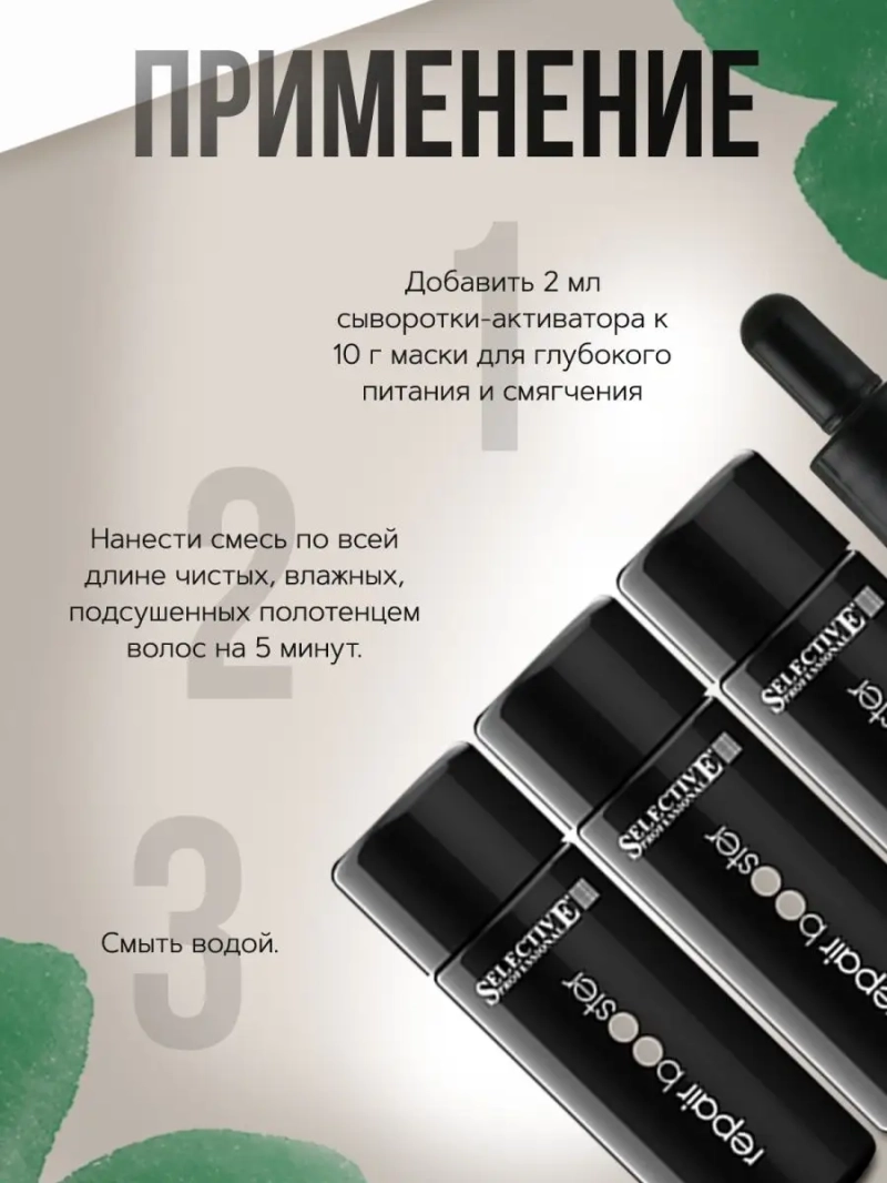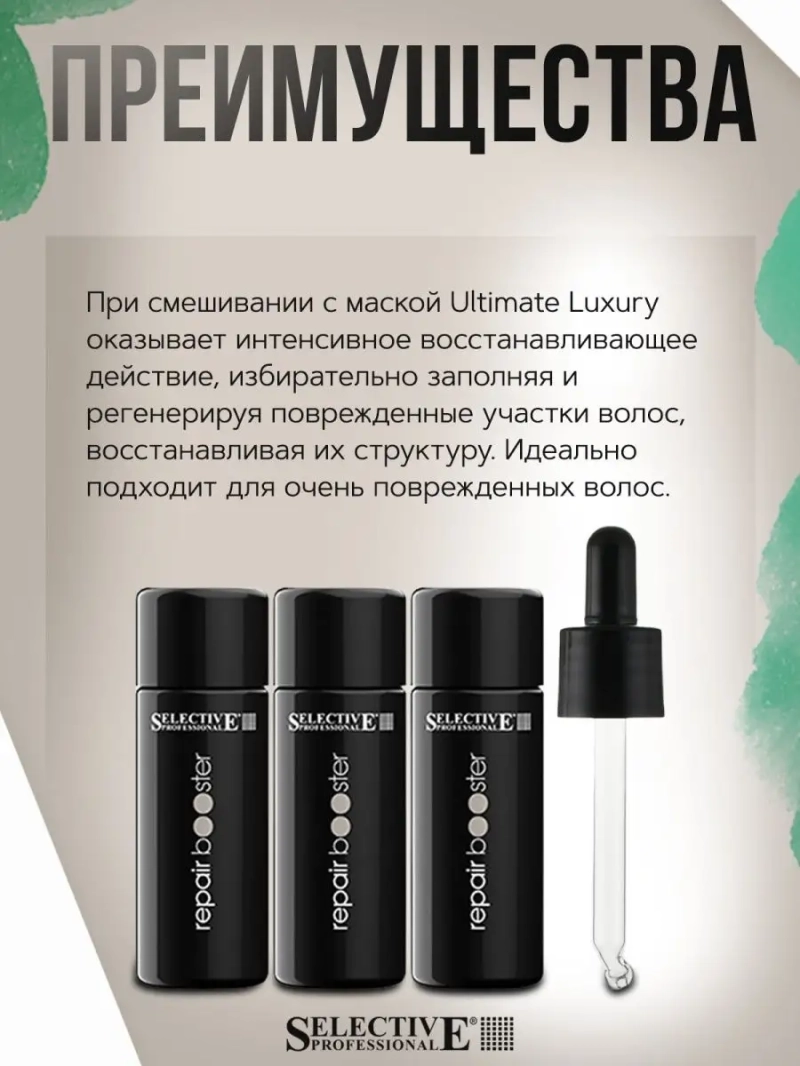 СЫВОРОТКА-АКТИВАТОР КОНЦЕНТРИРОВАННАЯ ВОССТАНАВЛИВАЮЩАЯ REPAIR BOOSTER CAVIAR SUBLIME, SELECTIVE, 3*25 МЛ. Repair Booster от Selective - сыворотка-активатор с высокой концентрацией белков и кератина. При смешивании с маской Ultimate Luxury оказывает интенсивное восстанавливающее действие, избирательно заполняя и регенерируя поврежденные участки волос, восстанавливая их структуру. Идеально подходит для очень поврежденных волос. Способ применения: Добавьте 1 мл сыворотки на каждые 10 г маски. Нанесите смесь по всей длине на чистые, влажные, подсушенные полотенцем волосы. Оставьте для воздействия на 3-5 минут. Смойте водой. В зависимости от проблемы увлажняющую сыворотку можно смешивать с другими сыворотками-активаторами. Пропорции смешивания выбираются в соответствии с типом волос.