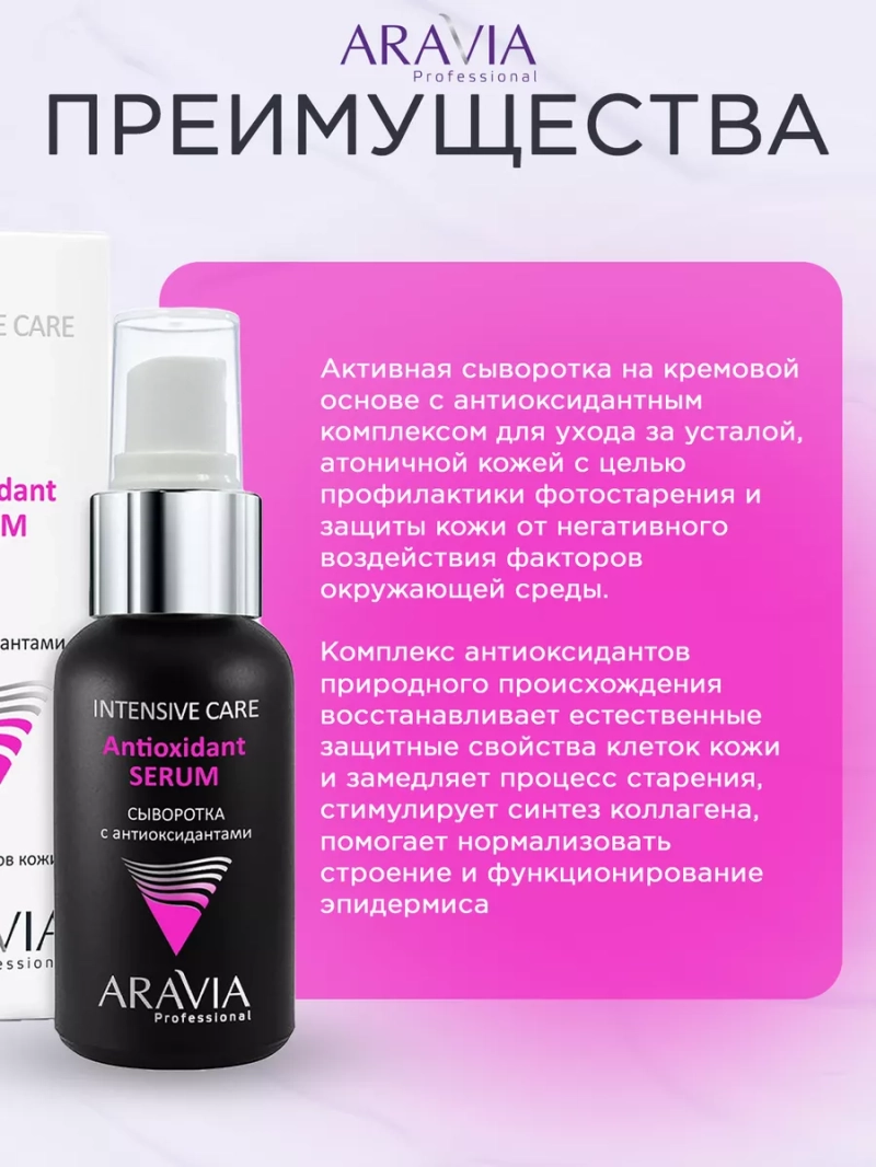 Активная сыворотка на кремовой основе с антиоксидантным комплексом для ухода за усталой, атоничной кожей с целью профилактики фотостарения и защиты кожи от негативного воздействия факторов окружающей среды. Комплекс антиоксидантов природного происхождения восстанавливает естественные защитные свойства клеток кожи и замедляет процесс старения, стимулирует синтез коллагена, помогает нормализовать строение и функционирование эпидермиса. Глюкозаминогликаны, аминокислоты и гидролизованные протеины риса наполняют клетки влагой, способствуя активизации обменных процессов и разглаживанию морщин. В результате курсового использования улучшается состояние кожи, возвращается здоровый цвет лица и сияние.