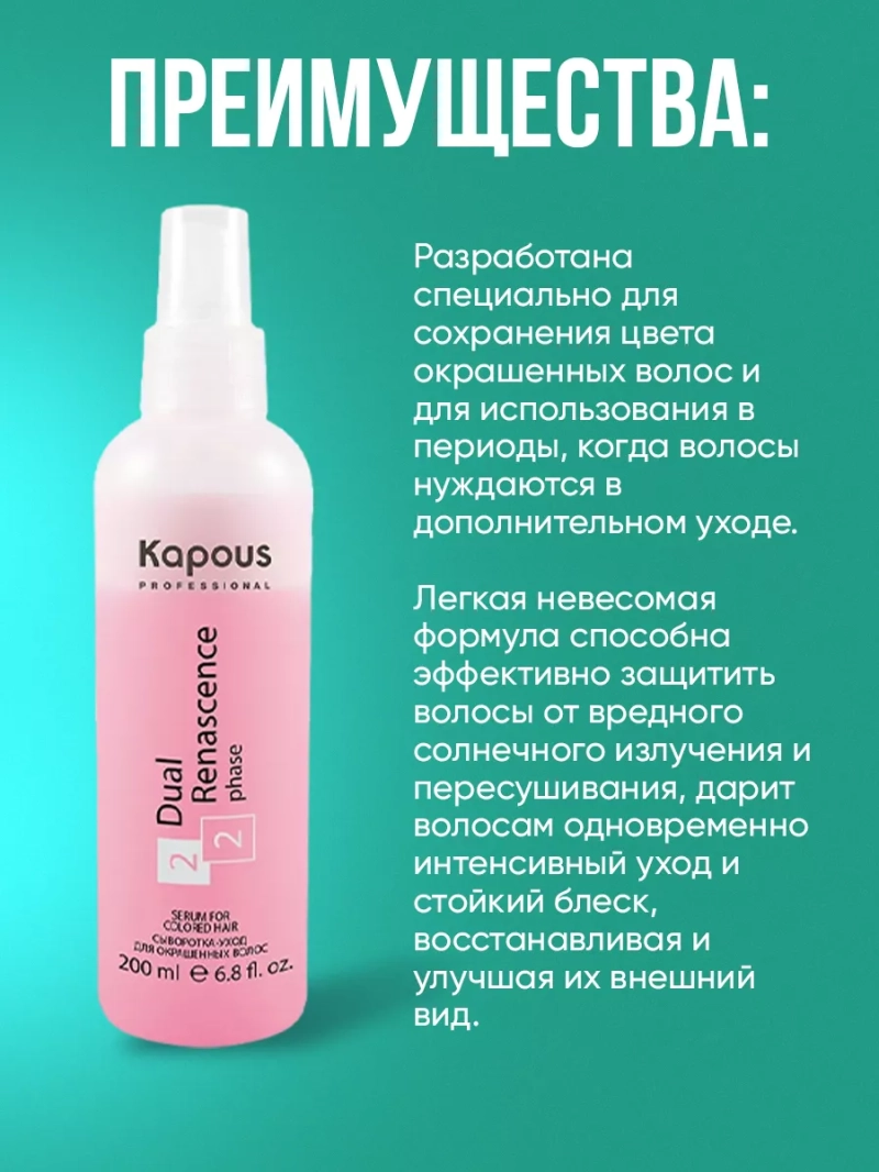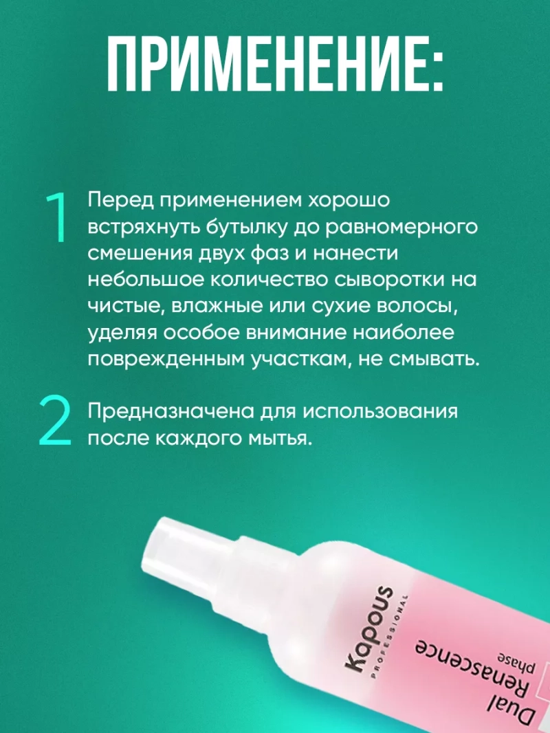 Сыворотка-уход для окрашенных волос "Dual Renascence 2 phase" разработана специально для сохранения цвета окрашенных волос и для использования в периоды, когда волосы нуждаются в дополнительном уходе. Легкая невесомая формула способна эффективно защитить волосы от вредного солнечного излучения и пересушивания, дарит волосам одновременно интенсивный уход и стойкий блеск, восстанавливая и улучшая их внешний вид. Органический экстракт семян подсолнечника и белки растительного происхождения, содержат глюкозу и фруктозу, которые проникают глубоко в структуру волос обеспечивая волосам дополнительное питание и увлажнение. Молочная аминокислота способствует процессам регенерации и обновления клеток кожи и является регулятором гидробаланса кожи головы и волос. УФ-фильтры защищают волосы от негативного воздействия солнца, тем самым предотвращая преждевременное вымывание и выгорание цвета, что позволяет сохранять цвет окрашенных волос насыщенным и многогранным на протяжении долгого периода времени. При регулярном применении сыворотка защищает волосы от ежедневного стресса, облегчает их расчесывание, делает их послушными, мягкими и здоровыми, придавая им сияющий блеск и неповторимый цвет. Способ пименения: перед применением хорошо встряхнуть бутылку до равномерного смешения двух фаз и нанести небольшое количество сыворотки на вымытые, подсушенные полотенцем волосы, уделяя особое внимание наиболее поврежденным участкам, не смывать. Предназначен для использования после каждого мытья. Допускается наносить на сухие волосы.