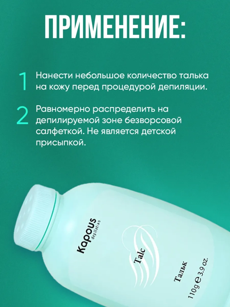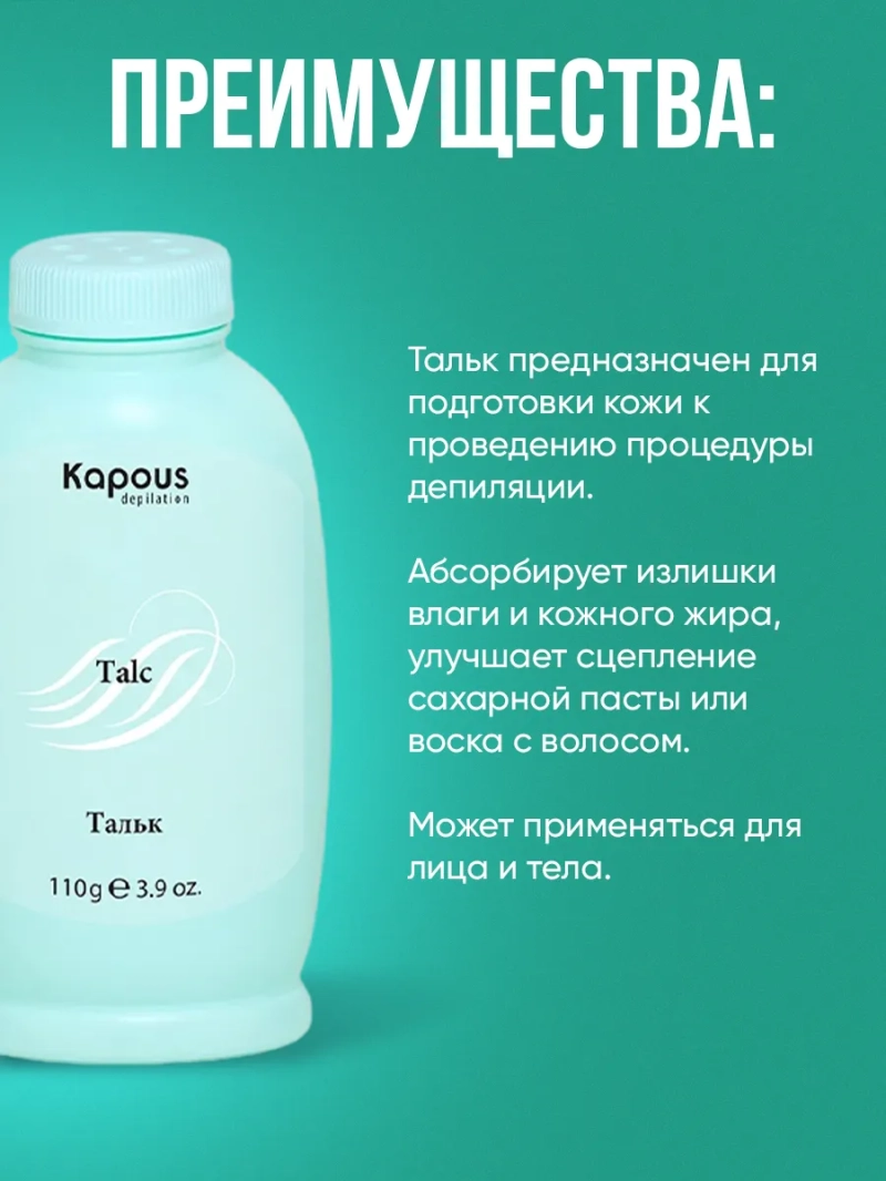 Тальк для депиляции 110г от Kapous – это ваш незаменимый помощник в проведении процедур по удалению нежелательных волос. Он идеально подготовит кожу, обеспечивая комфорт и высокую эффективность депиляции. С этим продуктом вы сможете достичь безупречных результатов, которые подарят вашей коже гладкость и ухоженность. Тальк Kapous разработан с учетом всех потребностей кожи. Его уникальная формула абсорбирует излишки влаги и кожного жира, создавая идеальную поверхность для сцепления с сахарной пастой или воском. Благодаря этому, ваши волоски будут удалены эффективно, а риск повреждения кожи значительно снижается. Тальк обволакивает каждый волосок, помогая минимизировать раздражение и другие нежелательные последствия, которые могут возникнуть в процессе депиляции. Универсальность применения Талька Kapous делает его идеальным выбором как для лица, так и для тела. Он мягко заботится о вашей коже и гарантирует безупречный результат в любой области. Перед началом процедуры рекомендуется нанести тальк тонким слоем на обрабатываемую зону. Это обеспечит максимально эффективное удаление волос, так как тальк способствует прочному сцеплению с депиляционным продуктом. Во время процедуры держите тальк под рукой для поддержки идеального сцепления. При необходимости, дополнительно наносите его на обрабатываемую зону, чтобы обеспечить максимальную эффективность. После завершения процедуры не забудьте нанести немного талька на обработанную область – это поможет успокоить и смягчить кожу, предотвращая появление покраснений и раздражений. Тальк для депиляции 110г от Kapous – это ваш идеальный помощник для комфортной и эффективной депиляции. Храните его в сухом месте, защищенном от влаги, и добавьте в свою корзину прямо сейчас, чтобы сделать процедуру удаления волос максимально приятной и безопасной. Напоминаем, что данный продукт предназначен исключительно для взрослых.