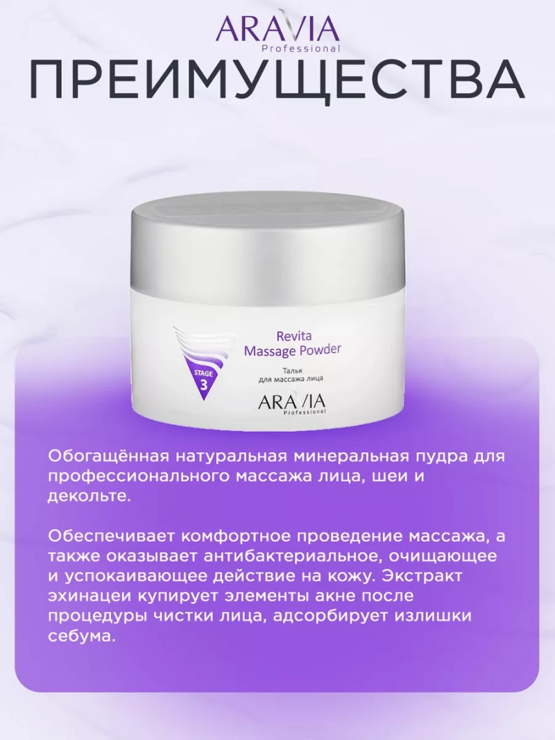 ТАЛЬК ДЛЯ МАССАЖА ЛИЦА REVITA MASSAGE POWDER, 150 МЛ. Обогащённая натуральная минеральная пудра для профессионального массажа лица, шеи и декольте. Обеспечивает комфортное проведение массажа, а также оказывает антибактериальное, очищающее и успокаивающее действие на кожу. Экстракт эхинацеи купирует элементы акне после процедуры чистки лица, адсорбирует излишки себума. Назначение: для косметологической процедуры массажа по Жаке, пластического, а также корректирующего ухода за кожей при помощи аппарата Дарсонваль. Рекомендации для использования: Профессиональный уход: рекомендуется использовать после гигиенической чистки лица. ДЕЙСТВИЕ: антибактериальное, противовоспалительное, очищающее, успокаивающее. Биоактивный состав: минеральный тальк, каолин, алюмокалиевые квасцы, комплекс сухих экстрактов растений. Состав продукта (INCI): Talc, Starch,Kaolin, Aluminum Starch Octenylsuccinate, Rice Powder, Echinacea Purpurea Root Extract. СПОСОБ ПРИМЕННЕНИЯ: Нанесите небольшое количество пудры на чистую подготовленную кожу с помощью ватного диска или сухой салфетки. Проведите процедуру. Остатки средства смойте тёплой водой или оставьте на коже и сверху нанесите выбранную маску. Меры предосторожности: не наносите средства на поврежденную кожу и избегайте попадания в глаза. При попадании в глаза тщательно промойте водой. Перед применением тестируйте на небольшом участке кожи.