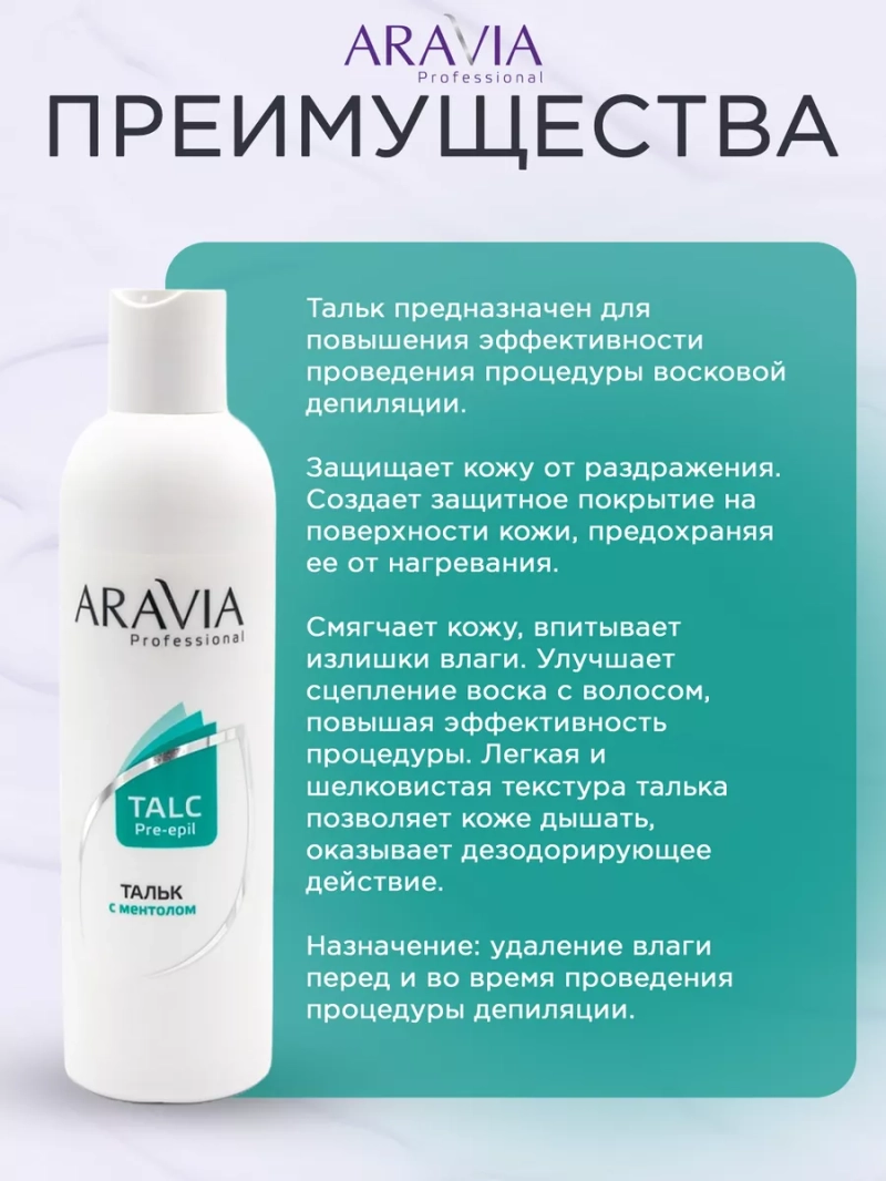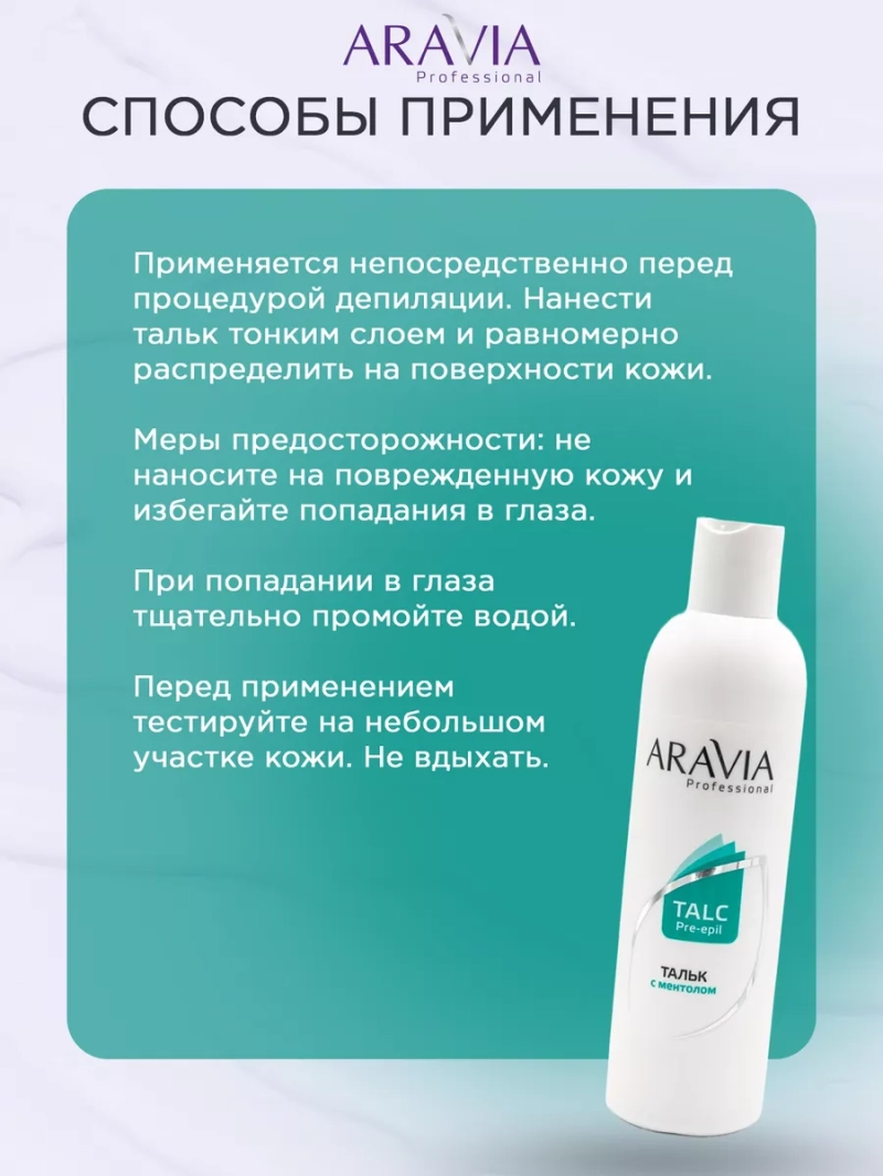 ТАЛЬК С МЕНТОЛОМ, 300 МЛ. Тальк предназначен для повышения эффективности проведения процедуры восковой депиляции. Защищает кожу от раздражения. Создает защитное покрытие на поверхности кожи, предохраняя ее от нагревания. Смягчает кожу, впитывает излишки влаги. Улучшает сцепление воска с волосом, повышая эффективность процедуры. Легкая и шелковистая текстура талька позволяет коже дышать, оказывает дезодорирующее действие. Назначение: удаление влаги перед и во время проведения процедуры депиляции. Рекомендации для использования: для профессионального использования. СПОСОБ ПРИМЕНЕНИЯ: Применяется непосредственно перед процедурой депиляции. Нанести тальк тонким слоем и равномерно распределить на поверхности кожи. Меры предосторожности: не наносите на поврежденную кожу и избегайте попадания в глаза. При попадании в глаза тщательно промойте водой. Перед применением тестируйте на небольшом участке кожи. Не вдыхать.