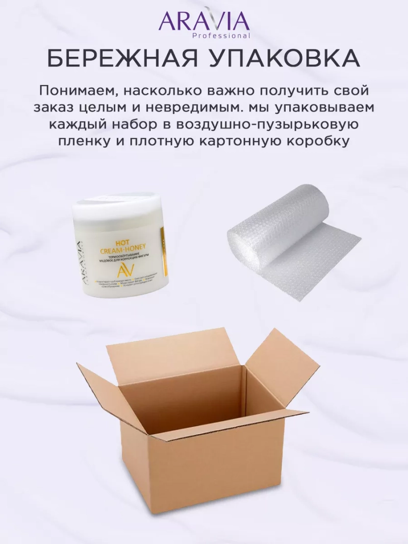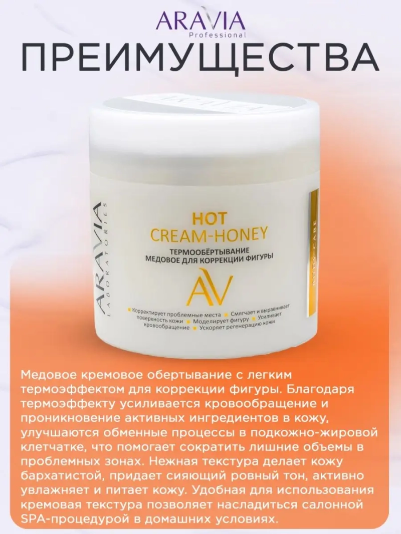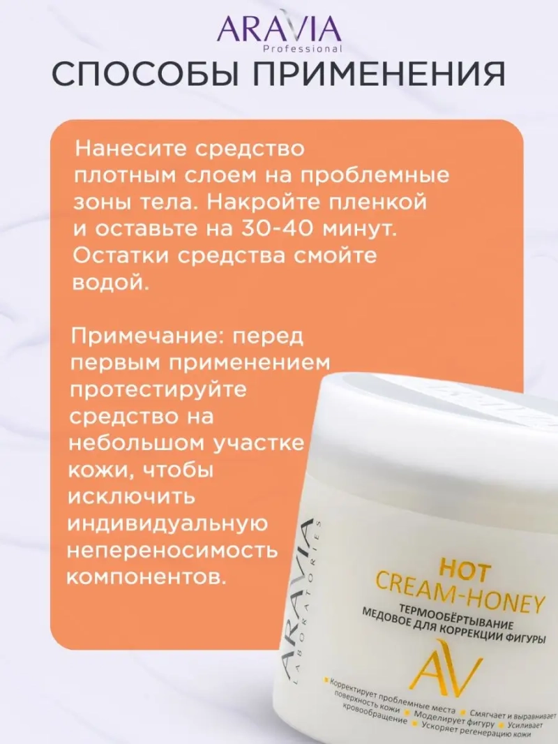 ТЕРМООБЁРТЫВАНИЕ МЕДОВОЕ ДЛЯ КОРРЕКЦИИ ФИГУРЫ HOT CREAM-HONEY, 300 МЛ. Медовое кремовое обертывание с легким термоэффектом для коррекции фигуры. Благодаря термоэффекту усиливается кровообращение и проникновение активных ингредиентов в кожу, улучшаются обменные процессы в подкожно-жировой клетчатке, что помогает сократить лишние объемы в проблемных зонах. Нежная текстура делает кожу бархатистой, придает сияющий ровный тон, активно увлажняет и питает кожу. Удобная для использования кремовая текстура позволяет насладиться салонной SPA-процедурой в домашних условиях. Назначение: при атоничной коже, целлюлите и во время похудения. Рекомендации для использования: 1-2 раза в неделю курсом из 10-15 процедур. Биоактивный состав: каолин, экстракт жгучего перца, масло лесного ореха, масло сладкого миндаля, масло ши, витамин Е. Каолин — обладает мягким отшелушивающим действием, эффективно очищает кожу, подсушивает и снимает воспаления, стимулирует регенерацию клеток и насыщает их кислородом, способствует образованию коллагена, придающего тканям эластичность. Масло оказывает разглаживающий и восстанавливающий эффект. Масло сладкого миндаля — содержит витамины А, Е и F. Насыщает кожу полезными веществами и влагой, запускает процесс регенерации клеток. Повышает тонус кожи. Масло ши — обладает выраженным антиоксидантным действием, стимулирует замедлившиеся процессы метаболизма увядающей кожи и регенерацию клеток. Укрепляет ослабленную кожу, делает ее более плотной и эластичной. Витамин Е — способствует обновлению клеток, замедляет появление видимых признаков старения кожи, в том числе преждевременное образование морщин, борется со свободными радикалами, уменьшает пигментацию, улучшает насыщение клеток кислородом, помогает поддерживать уровень влаги, способствует повышению упругости. СПОСОБ ПРИМЕНЕНИЯ: Нанесите средство плотным слоем на проблемные зоны тела. Накройте пленкой и оставьте на 30-40 минут. Остатки средства смойте водой.