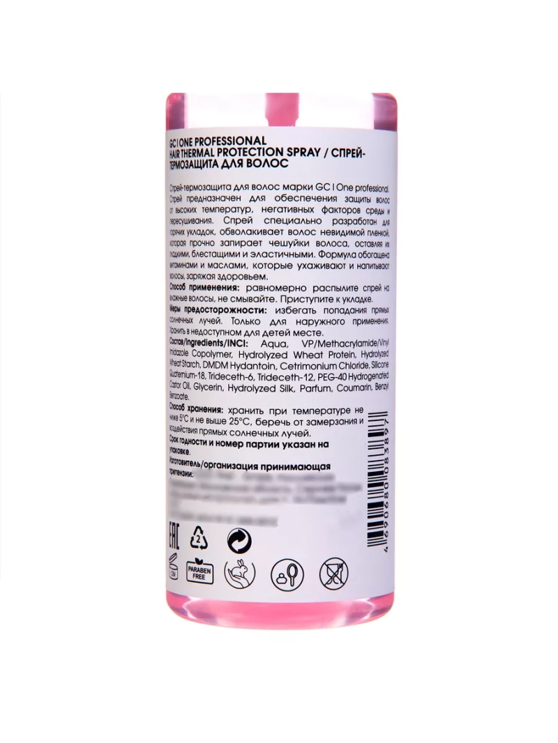 Спрей-термозащита для волос GC|one Professional - это эффективное средство, которое обеспечивает надежную защиту волос от воздействия высоких температур при использовании утюжков, фены и других термических устройств для укладки. Он создает невидимую защитную пленку на поверхности волос, которая предотвращает перегрев и иссушение волос во время термической обработки. Таким образом, спрей помогает сохранить здоровье и красоту ваших волос, предотвращая их ломкость, сечение и потерю блеска. Кроме того, спрей-термозащита также обладает увлажняющими и питательными свойствами, которые придают волосам дополнительный объем, мягкость и шелковистость. Он помогает сделать вашу укладку более стойкой и эффектной, придавая волосам здоровый и естественный блеск.Термозащиту можно применять для любых горячих укладок - феном/плойкой и даже при ламинировании, она защищает волос даже при 300С. Спрей способен заменить сыворотку и эликсир для волос. Дарит легкое расчесывание и дополнительный объем, оказывает антистатическое воздействие и ухаживает за кутикулой по всей длине. Сделайте ваши волосы гладкими и шелковистыми, используя наш инновационный спрей для волос созданный для комплексного ухода за вашими кончиками! Крем элексир сочетает в себе термозащиту, увлажняющий уход, а также невесомую формулу, которая добавляет объем вашим волосам. Обепечьте себе легкое расчесывание и защиту от секущихся кончиков. Уникальное несмываемое средство для здоровых и поврежденных волос, натуральных или окрашенных. Несмывашка разглаживает локоны, делает их мягкими и послушными после первого использования. Рекомендуем использовать этот стайлинг продукт после мытья, перед сушкой феном и утюжком. Способ применения: нанести на чистые и подсушенные полотенцем волосы в необходимом количестве (в зависимости от их длины, состояния и пористости). Распределить продукт расческой по всей длине, включая кончики. Не смывая, приступить к укладке волос.