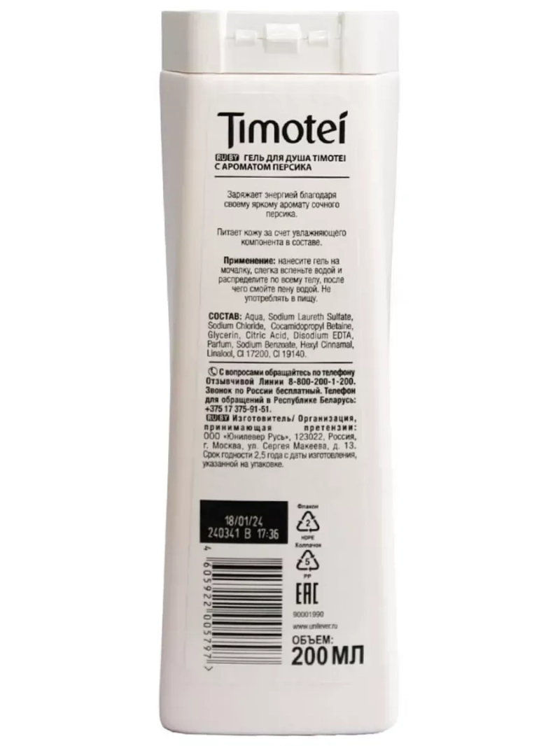Полное наименование: TIMOTEI/Тимотей Гель для душа с ароматом персика 200мл Производитель: Unilever Россия. Новинка от Timotei – гель для душа с ароматом персика из серии Смузи Бар. Он заряжает энергией благодаря яркому ароматуперсика. Отлично пенится, бережно очищает и питает кожу за счет увлажняющего компонента в составе. Женский гель для душа представлен в объеме 200 мл, им удобно пользоваться дома и брать с собой в зал или бассейн. Меры предосторожности: избегай попадания в глаза, при попадании в глаза тщательно промой их водой.