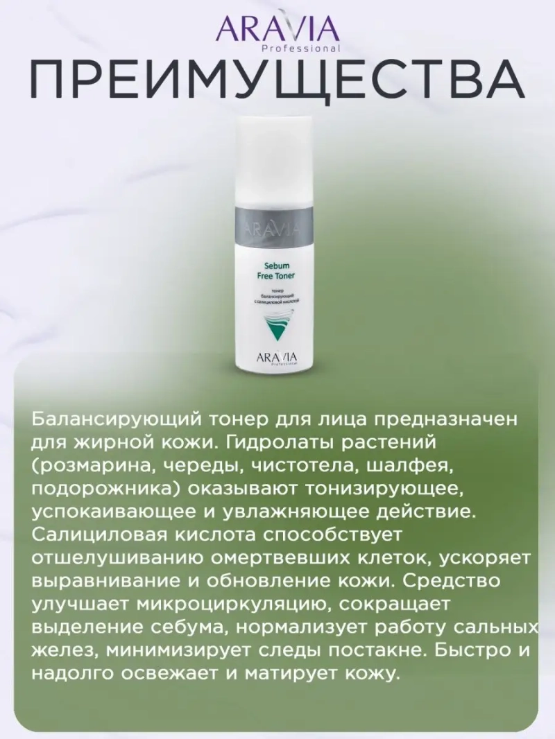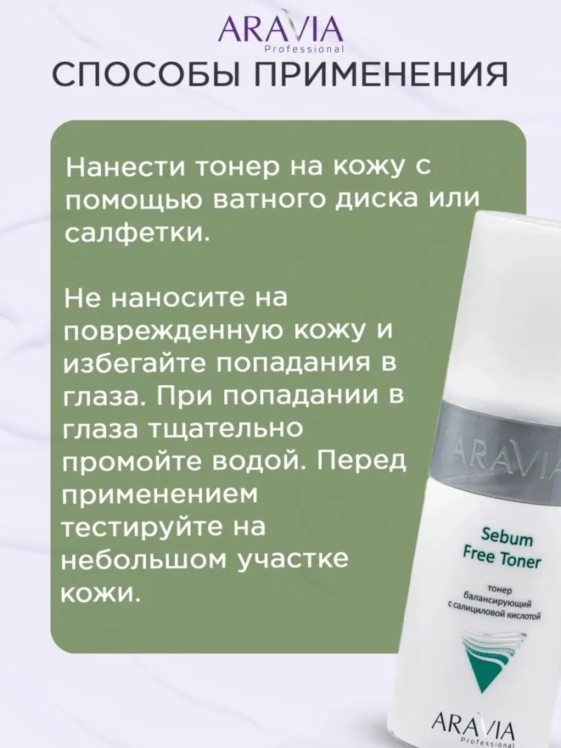ARAVIA Professional Тонер с салициловой кислотой - это профессиональный уход за кожей лица, который поможет решить множество проблем. Этот тоник от купероза и средство от пигментации на лице содержит ниацинамид, который улучшает цвет лица и делает его более сияющим. Органический тоник омолаживающий и профессиональный тонер aravia позволяют эффективно ухаживать за кожей, удалять остатки макияжа и грязи, а также устранять красноту и раздражение. Кора от пигментации и тоник для лица aravia помогут справиться с проблемами пигментации и купероза на лице. Это профессиональная косметика для лица, которая подарит Вам здоровую и красивую кожу. Уход за кожей и уход за лицом станут легкими и приятными процедурами благодаря этому тонику для лица аравия.