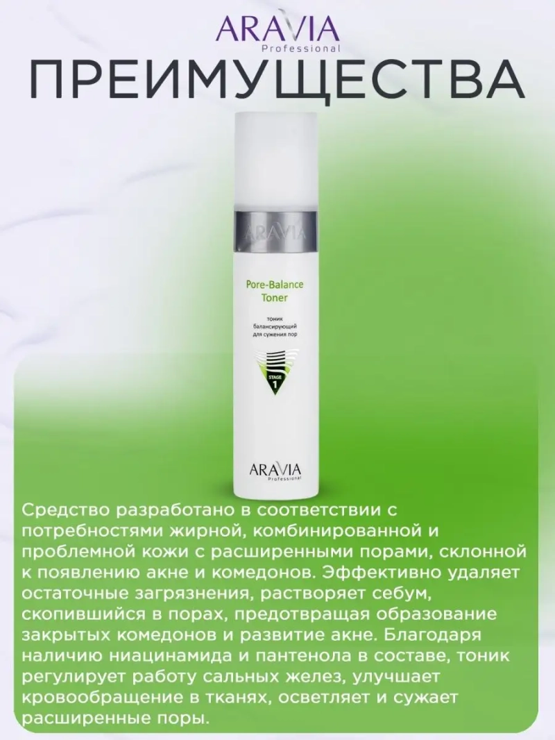 Тоник балансирующий для сужения пор для жирной и проблемной кожи Pore-Balance Toner. Средство разработано в соответствии с потребностями жирной, комбинированной и проблемной кожи с расширенными порами, склонной к появлению акне и комедонов. Эффективно удаляет остаточные загрязнения, растворяет себум, скопившийся в порах, предотвращая образование закрытых комедонов и развитие акне. Благодаря наличию ниацинамида и пантенола в составе, тоник регулирует работу сальных желез, улучшает кровообращение в тканях, осветляет и сужает расширенные поры, матирует и избавляет от жирного блеска. Назначение: этап тонизирования в косметологической процедуре. Подготовка кожи к дальнейшему уходу. Рекомендации для использования: Профессиональный уход: для этапа тонизирования в косметологической процедуре. Домашний уход: по назначению косметолога. ДЕЙСТВИЕ: Очищающее, Восстанавливающее, Кератолитическое, Комедонолитическое, Тонизирующее. Биоактинвный состав: ниацинамид, мочевина, д-пантенол, лактулоза. Ниацинамид - уменьшает активность сальных желез, сужает и осветляет поры, купирует воспаления, предотвращает появление новых. Мочевина - обладает противовоспалительными, заживляющими и восстанавливающими свойствами. Способствует отшелушиванию и обновлению. Д-пантенол - уменьшает гиперемию, успокаивает кожу, оказывает дополнительный кератолитический эффект для нормализации оттока кожного сала. Лактулоза - повышает естественный иммунитет, усиливает барьерную защитную функцию. Состав продукта: Aqua, Glycerin, Niacinamid, Inulin, Hydroxyethyl Urea, Phenoxyethanol, Panthenol, Alpha-Glucan Oligosaccharide, Ethylhexylglycerin, PEG-40 Hydrogenated Castor Oil, Parfum, Citric Acid , Hexyl Cinnamal