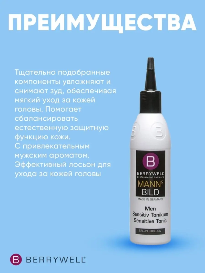 Тоник для чувствительной кожи Berrywell Men Sensitive Tonic 126 мл. Тоник для чувствительной кожи MENNSBILD от Berrywell - это высококачественный эффективный бережный лосьон для ухода, специально предназначенный для сухой, покрасневшей и раздраженной кожи головы. Тщательно подобранные компоненты увлажняют и снимают зуд, обеспечивая мягкий уход за кожей головы. Помогает сбалансировать естественную защитную функцию кожи. С привлекательным мужским ароматом. Эффективный лосьон для ухода за кожей головы;Для сухой, покрасневшей и раздраженной кожи головы;С эффектом увлажнения;Снимает зуд;Для успокаивания кожи головы;Защищает кожу головы. Применение: равномерно нанести на корни волос путем деления на проборы, после ежедневного мытья. Осторожно массируйте. Не смывайте.
