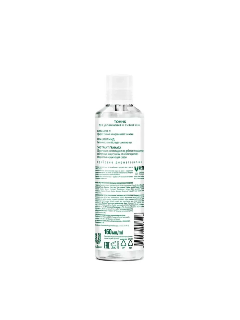 После умывания воспользуйся тоником для лица Идеальная кожа для всех типов кожи. Он удалит остатки макияжа, а также освежит и увлажнит кожу, подготовив ее к нанесению крема. Такой подход позволит забыть о несовершенствах кожи и тусклом цвете лица. Витамин С – мощный природный антиоксидант, придает сияние и выравнивает тон кожи. Ниацинамид увлажняет, участвует в нормализации обменных процессов кожи, способствует сужению пор. Экстракт граната обеспечивает антиоксидантное действие и поддерживает собственную защиту кожи от неблагоприятного воздействия окружающей среды. Пантенол смягчает и восстанавливает кожу.