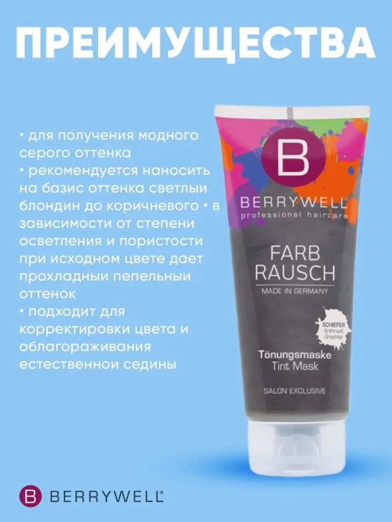 Тонирующая маска SCHIEFER (Grey). для получения модного серого оттенка; рекомендуется наносить на базис оттенка светлый блондин до коричневого; в зависимости от степени осветления и пористости при исходном цвете дает прохладный пепельный оттенок. Подходит для корректировки цвета и облагораживания естественной седины. Применение: После мытья головы обильно и равномерно нанести на высушенные полотенцем волосы. В зависимости от желаемой интенсивности цвета оставить для воздействия на 2-10 минут Тщательно смыть. Примечание: Во избежание загрязнения кожи или одежды в завершение полностью высушите волосы. Пожалуйста, используйте, подходящие перчатки.