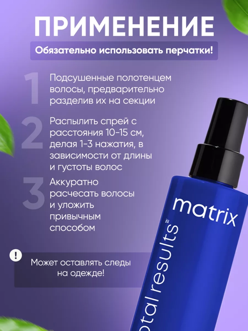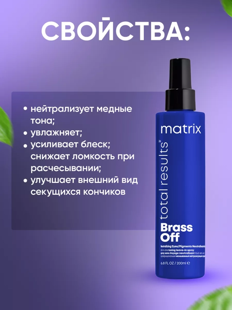 Все, кто хоть раз решался на процедуру осветления или мелирования волос в светлые тона, знают, как сложно добиться сияющего, холодного, жемчужного оттенка без желтизны и теплоты. Линия L’oreal Matrix Total Results Color Obsessed Brass Off (Лореаль Матрикс Колор Обсэст Брас Оф) создана специально для осветленных брюнеток, шатенок и обладателей темных волос, чтобы нейтрализовать желтизну и сохранить холодный оттенок блонда. Многофункциональный несмываемый спрей L’oreal Matrix Total Results Color Obsessed Brass Off дополняет и усиливает действие шампуня и маски для холодного блонда, но может использоваться и как отдельный продукт ухода за всеми типами и текстурами волос. Спрей идеален для нейтрализации нежелательных медных и светло – оранжевых подтонов у темного блонда и осветленного брюнета, подчеркивает холодные оттенки в осветленных волосах уровня с 5-го по 8-й. Уникальная формула содержит особый набор компонентов, оптимальный для поврежденных, пористых волос. Ухаживающее средство делает волосы менее жесткими после химического воздействия, восстанавливает, укрепляет и разглаживает структуру волос, уменьшает обламывание волосков в процессе расчесывания, стайлинга и укладки. Спрей глубоко увлажняет и облегчает расчесывание. Средство отлично работает в условиях высокой влажности и убирает лишнюю пушистость и торчащие волоски по всей длине. Тонирующий спрей заботится о кончиках, предотвращает их обламывание и дальнейшее сечение. Спрей – пшикалка делает волосы более послушными и подготавливает их к дальнейшей укладке. Не влияет на частоту мытья волос. Регулярное использование спрея поможет минимизировать использование дополнительных средств по уходу за волосами, силиконовых спреев – несмывашек и масел для разглаживания. Волосы будут лежать ровным полотном и иметь здоровый и ухоженный вид.Может использоваться не только в профессиональных салонах мастерами – парикмахерами и барберами, но и в домашних условиях. Содержит фиолетовый пигмент и может оставлять следы на одежде.