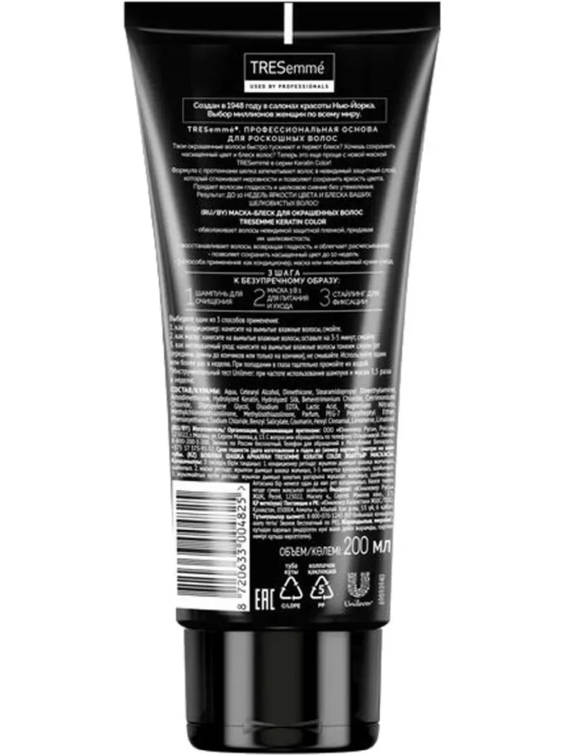 Полное наименование: TRESEMME/Тресемме Маска для окрашенных волос KERATIN COLOR 200мл. Производитель: Unilever Россия. Хочешь надолго сохранить насыщенный цвет и блеск волос после окрашивания? Попробуй новую маску TRESemme из серии Keratin Color! Формула с протеинами шелка запечатывает волос в невидимый защитный слой, который сглаживает неровности и позволяет сохранить яркость цвета. Придает волосам гладкость и шелковое сияние без утяжеления. Результат: до 10 недель яркости цвета и блеска ваших шелковистых волос*! *Инструментальный тест Unilever: при частоте использования шампуня и маски 3,5 раза в неделю