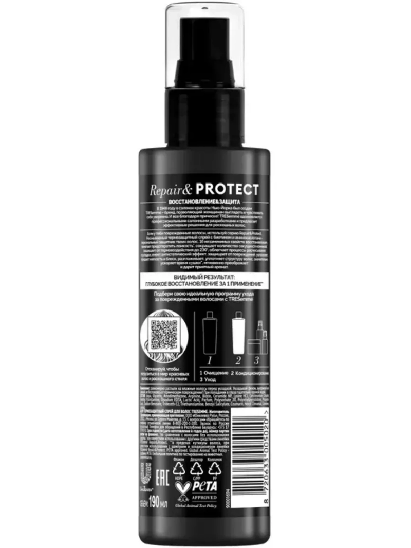 Полное наименование: TTRESEMME/Тресемме Спрей термозащитный для волос 190мл. Производитель: Unilever Россия. Встречай термозащитный спрей TRESemme с биотином из серии Repair & Protect в новом увеличенном объеме 190 мл! Спрей облегчает процесс укладки и значительно ускоряет время сушки*. Формула с гиалуроном и витамином Е увлажняет волосы и облегчает расчесывание. Спрей – твой идеальный помощник для создания подвижных локонов без утяжеления. Не оставляет шанса высоким температурам – выдерживает до 230°С. *По сравнению с волосами без использования средства.