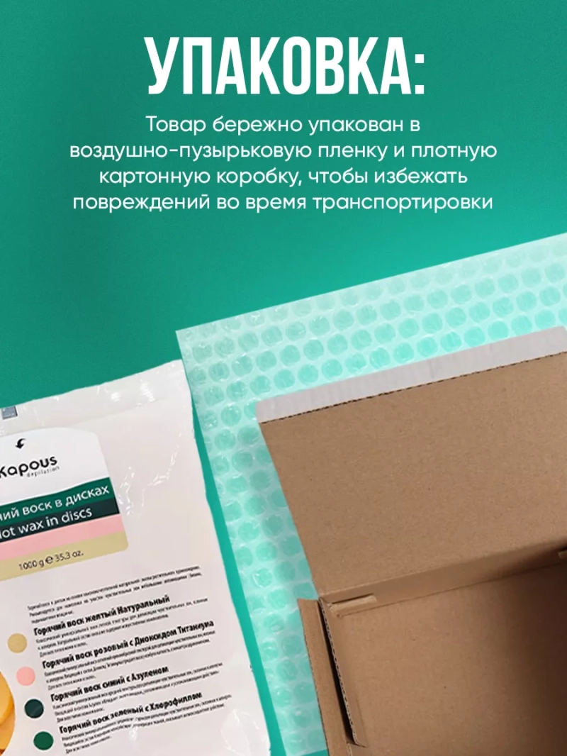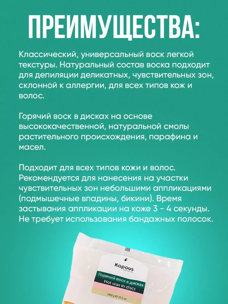 Натуральный горячий воск Желтый идеальное решение для эффективной и безопасной депиляции. Этот классический воск имеет универсальную текстуру, которая обеспечивает легкость и комфорт во время процедуры. Используя натуральные компоненты и высококачественную смолу растительного происхождения, этот воск подходит для депиляции деликатных и чувствительных участков кожи, а также для людей, склонных к аллергии.Особенности горячего воска Желтый:- Подходит для всех типов кожи и волос: Благодаря уникальной формуле, этот воск идеально подходит для всех типов кожи и волос. Вы можете использовать его как для депиляции лица и тела, так и для бикини или подмышечных впадин.- Легкое нанесение: Небольшие аппликации воска обеспечивают простое и удобное нанесение на кожу. Время застывания воска на коже составляет всего 3-4 секунды, что делает процедуру максимально быстрой и эффективной.- Без использования бандажных полосок: Одним из преимуществ горячего воска Желтый является его самостоятельное удаление без использования бандажных полосок. Это экономит ваше время и средства.- Натуральный состав: Компоненты воска, такие как парафин, масла и натуральная смола, дают ему высокую эластичность и удобство в использовании. Способ применения:1. Подготовьте кожу: Перед депиляцией рекомендуется очистить кожу с помощью очищающего средства Kapous. Это поможет удалить остатки косметики и грязи и обеспечить более эффективную депиляцию.2. Подготовьте воск: Растопите горячий воск на основе высококачественного воскоплава. Рабочая температура воска должна быть от 55C до 60C.3. Нанесение воска: Небольшим количеством талька обработайте депилируемую зону. Затем, с помощью шпателя, равномерно нанесите разогретый воск на кожу по росту волос. 4. Удаление воска: При помощи резкого движения удалите воск против роста волос, предварительно натянув кожу. Такой метод удаления обеспечивает максимальную эффективность и минимум боли.