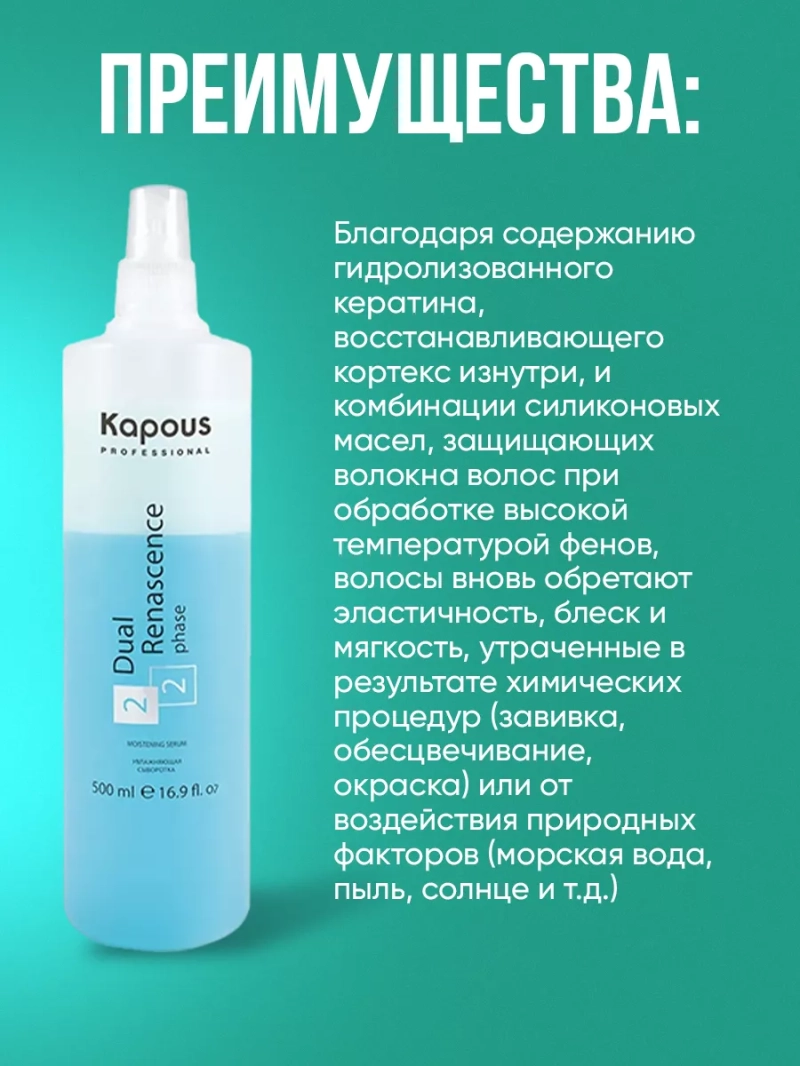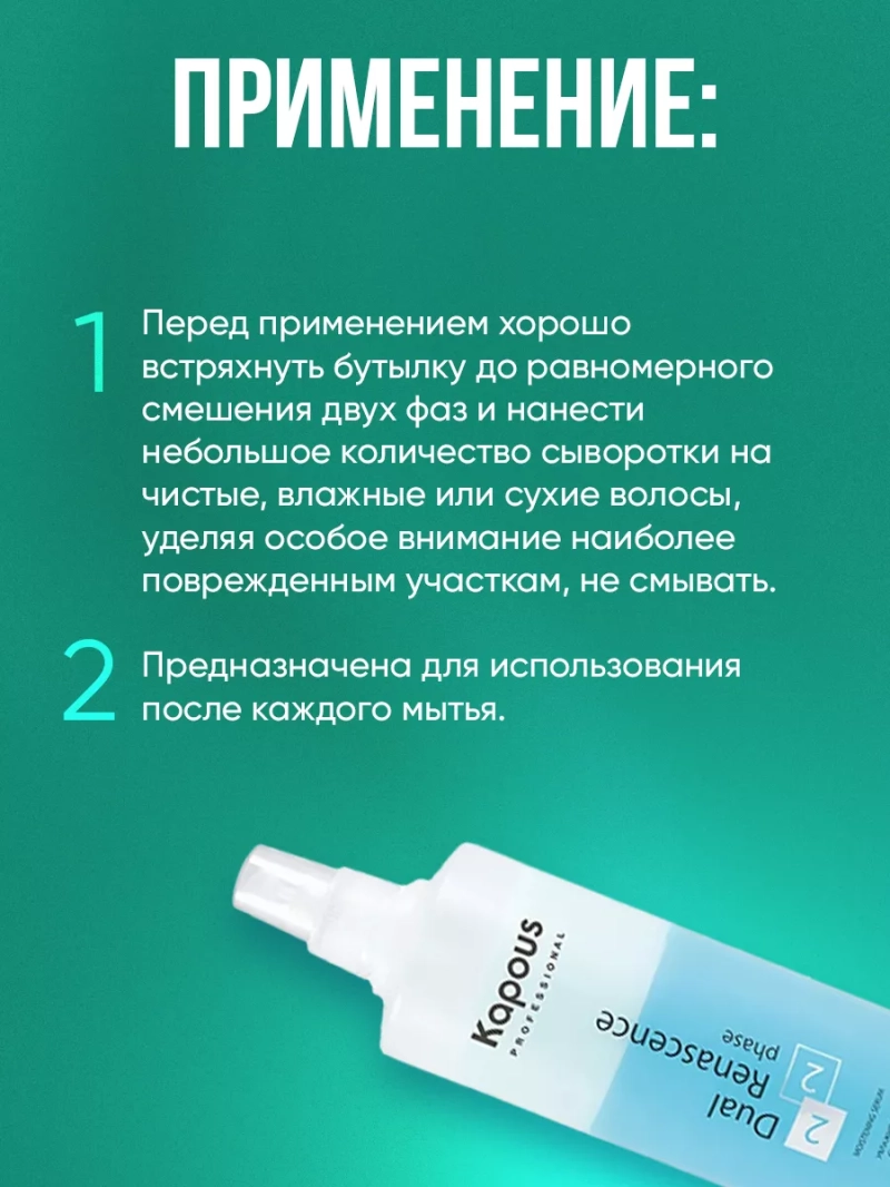 Высокоактивная ремонтирующая сыворотка "Dual Renascence 2 phase" разработана специально для всех типов волос. Комбинация двух фаз является прекрасным продуктом для защиты, восстановления и глубокого увлажнения волос. Благодаря содержанию гидролизованного кератина, восстанавливающего кортекс изнутри, и комбинации силиконовых масел, защищающих волокна волос при обработке высокой температурой фенов, волосы вновь обретают эластичность, блеск и мягкость, утраченные в результате химических процедур (завивка, обесцвечивание, окраска) или от воздействия природных факторов (морская вода, пыль, солнце и т.д.) Сыворотка защищает волосы от ежедневного стресса, облегчает их расчесывание и обеспечивает комплексный продолжительный уход по всей длине. Рекомендована для нанесения перед купанием в бассейне и море. Способ применения: Перед применением хорошо встряхнуть бутылку до равномерного смешения двух фаз и нанести небольшое количество сыворотки на чистые, влажные или сухие волосы, уделяя особое внимание наиболее поврежденным участкам, не смывать. Предназначена для использования после каждого мытья. Состав: AQUA (WATER), CYCLOPENTASILOXANE, DIMETHICONE, CETRIMONIUM CHLORIDE, SODIUM CHLORIDE, POLYSORBATE 20, PHENYL TRIMETHICONE, CETYL PEG/PPG-10/1 DIMETHICONE, DIMETHICONOL, LACTIC ACID, AMODIMETHICONE, POLYQUATERNIUM-28, BENZOPHENONE-4, HYDROLYZED KERATIN, CAPRYLYL GLYCOL, CI 42090 (FD&C BLUE 1), PHENOXYETHANOL, ETHYLHEXYLGLYCERIN, POTASSIUM SORBATE, SODIUM BENZOATE, LIMONENE, BENZYL BENZOATE, HEXYL CINNAMAL, LINALOOL, BENZYL SALICYLATE, CITRONELLOL, HYDROXYCITRONELLAL, EUGENOL, PARFUM (FRAGRANCE)