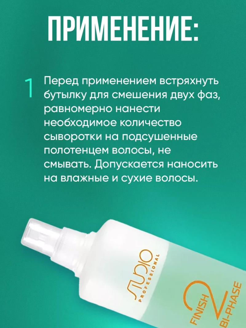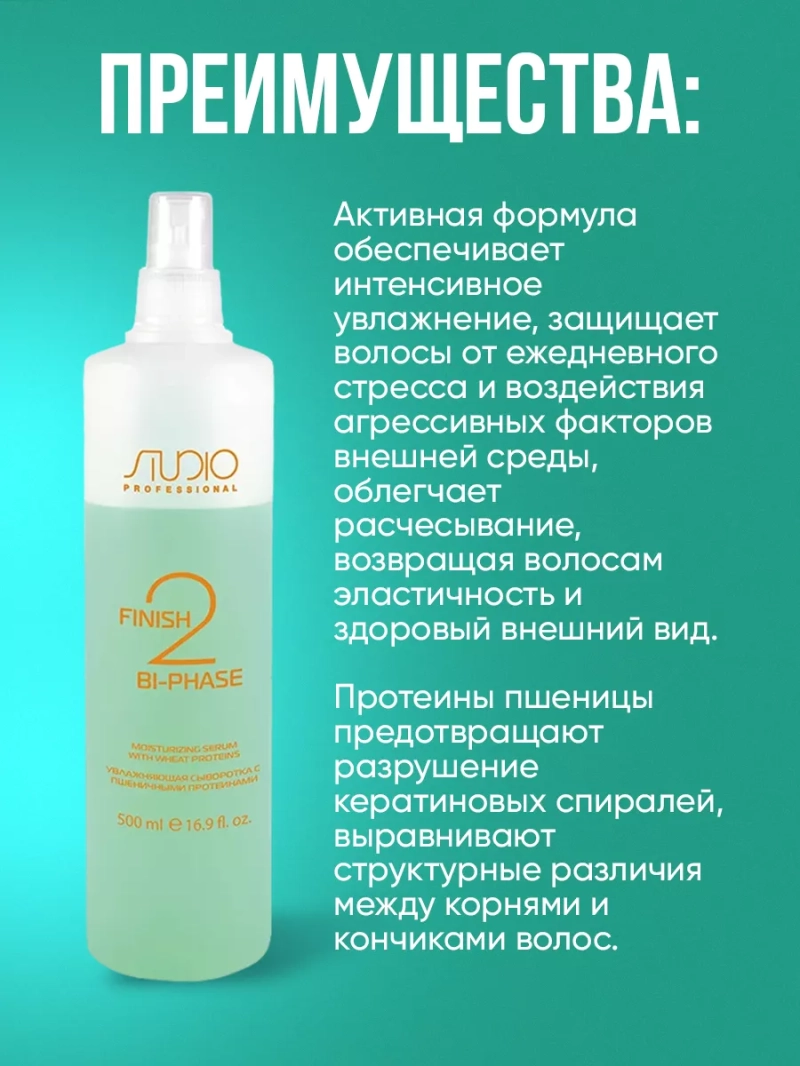 Сыворотка с пшеничными протеинами для волос Finish Bi-phasw - активная формула обеспечивает интенсивное увлажнение, защищает волосы от ежедневного стресса и воздействия агрессивных факторов внешней среды, облегчает расчесывание, возвращая волосам эластичность и здоровый внешний вид. Протеины пшеницы предотвращают разрушение кератиновых спиралей, выравнивают структурные различия между корнями и... Сыворотка с пшеничными протеинами для волос Finish Bi-phasw - активная формула обеспечивает интенсивное увлажнение, защищает волосы от ежедневного стресса и воздействия агрессивных факторов внешней среды, облегчает расчесывание, возвращая волосам эластичность и здоровый внешний вид. Протеины пшеницы предотвращают разрушение кератиновых спиралей, выравнивают структурные различия между корнями и кончиками волос. Молочная аминокислота оказывает смягчающее воздействие, способствует процессам обновления и является регулятором баланса влаги кожи головы и волос, предотвращает скопление свободных радикалов. Способ применения: Перед применением встряхнуть бутылку для смешения двух фаз, равномерно нанести необходимое количество сыворотки на подсушенные полотенцем волосы, не смывать. Допускается наносить на влажные и сухие волосы.