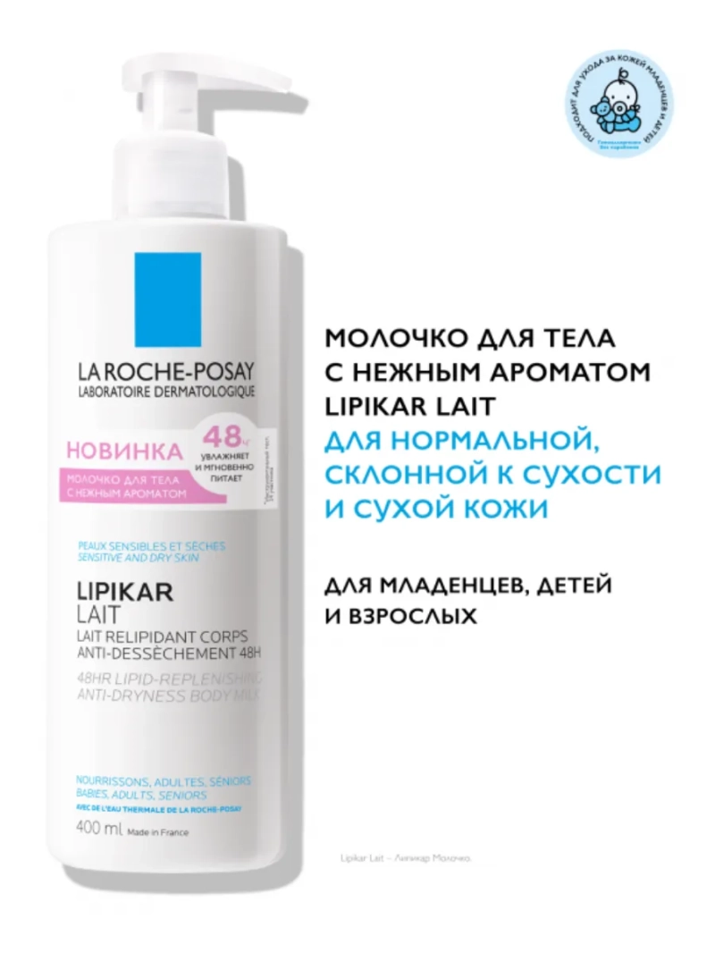 Увлажняющее молочко для тела с отдушкой Lipikar Lait предназначено для нормальной, склонной к сухости и сухой кожи младенцев, детей и взрослых. Увлажняющий крем для тела питает нежную и чувствительную кожу 48 часов, восстанавливают ее защитный барьер и предупреждают снижение защитных свойств сухой кожи, обладает противовоспалительным действием. Безопасное и мягкое средство, подходящее для взрослых и детей, включая новорожденных. Термальная вода ЛяРош в составе средства богата селеном и является природным антиоксидантом. Некомедогенный лосьон обогащен витаминами и натуральными экстрактами для дополнительного увлажнения, которые питают кожу и способствуют восстановлению ее защитного барьера. Крем для тела ля рош для очень сухой кожи разработано с учетом всех потребностей самих чувствительных типов кожи. Успокаивающий крем помогает справляться с раздражением, зудом и воспалениями, возвращая сухой коже её естественное здоровье. Средство идеально подходит для ежедневного использования и обеспечивает интенсивное увлажнение и питание на протяжении длительного времени, делая поврежденную кожу мягкой, гладкой и здоровой. Обеспечивает комфорт и смягчение даже самой сухой, чувствительной и атопичной кожи взрослых, детей и новорожденных младенцев 0+. Бархатистая и мягкая текстура питательного флюида быстро впитывается и не оставляет белых следов на коже и одежде после нанесения. Безопасная формула средства не вызывает раздражения и не закупоривает поры. Не оставляет липкости и не стягивает кожу после впитывания. Без отдушек и красителей. Протестировано под контролем педиатров и дерматологов. Гипоаллергенный санскрин подходит для нежной светлой и смуглой кожи. Для всех типов кожи, в том числе кожи, склонной к аллергии и атопии. Наносите крем баттер на чистую сухую кожу легкими массирующими движениями до полного впитывания. Откройте для себя французскую аптечную косметику - это идеальное средство ля рош посэй для увлажнения и ухода за сухой и очень сухой кожей всей вашей семьи!