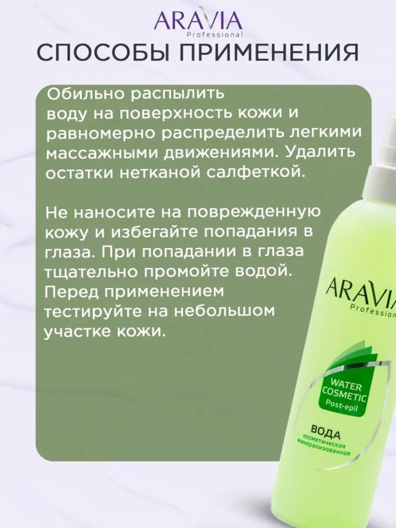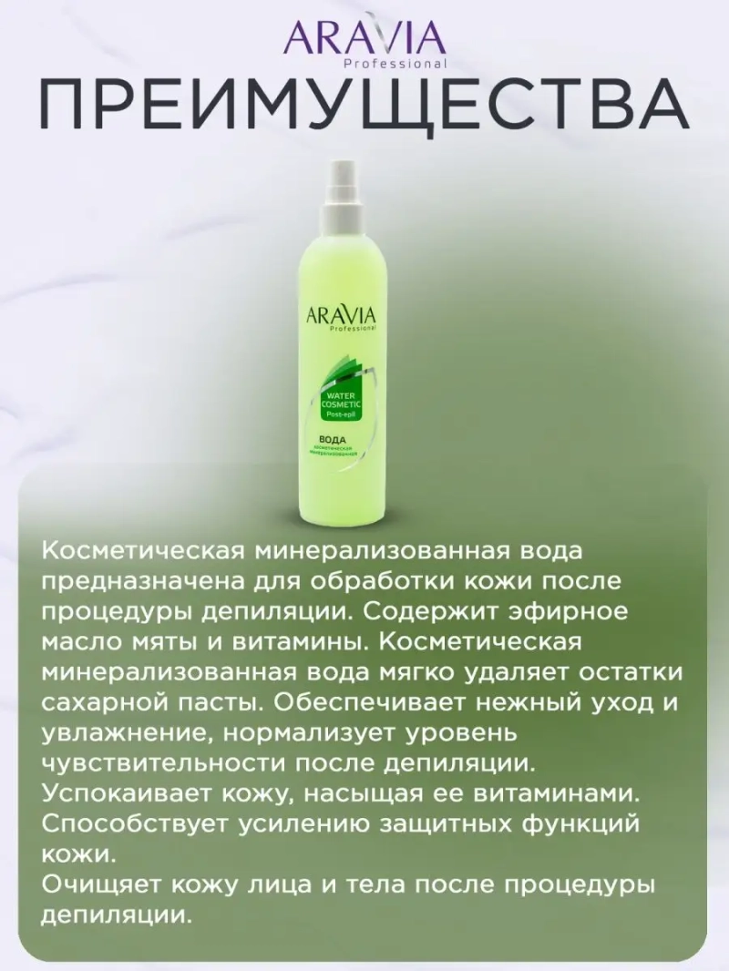 ВОДА КОСМЕТИЧЕСКАЯ МИНЕРАЛИЗОВАННАЯ С МЯТОЙ И ВИТАМИНАМИ, 300 МЛ. Косметическая минерализованная вода предназначена для обработки кожи после процедуры депиляции. Содержит эфирное масло мяты и витамины. Косметическая минерализованная вода мягко удаляет остатки сахарной пасты. Обеспечивает нежный уход и увлажнение, нормализует уровень чувствительности после депиляции. Успокаивает кожу, насыщая ее витаминами. Способствует усилению защитных функций кожи. Назначение: очищение кожи лица и тела после процедурой депиляции. Биоактивный состав: экстракт цветков ромашки, аллантоин, экстракт мяты. Состав продукта (INCI): Aqua, Trimethylglycine, Chamomilla Recutita Flower Extract, Pantenol, PEG-40 Hydrogenated Castor Oil, Allantoin, Mentha Piperita (Peppermint) Oil, DMDM Hydantoin, Iodopropynyl Butylcarbamate, Sodium-EDTA, CI 47005. СПОСОБ ПРИМЕНЕНИЯ: Обильно распылить воду на поверхность кожи и равномерно распределить легкими массажными движениями. Удалить остатки нетканой салфеткой. Меры предосторожности: не наносите на поврежденную кожу и избегайте попадания в глаза. При попадании в глаза тщательно промойте водой. Перед применением тестируйте на небольшом участке кожи.
