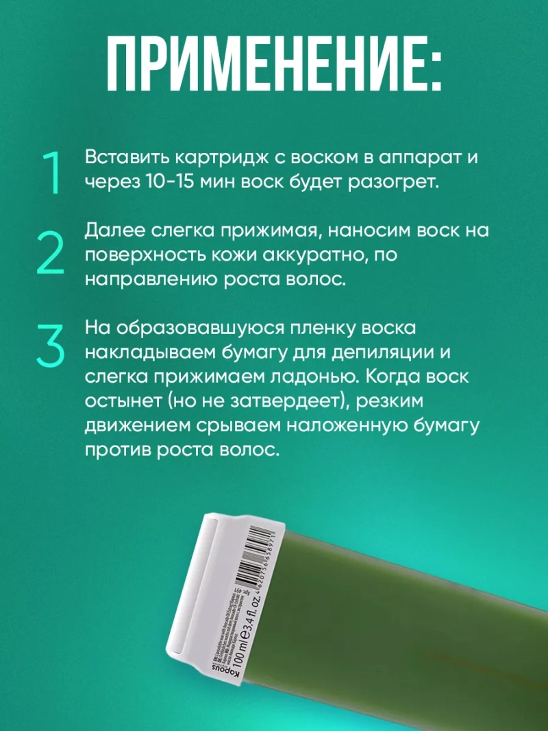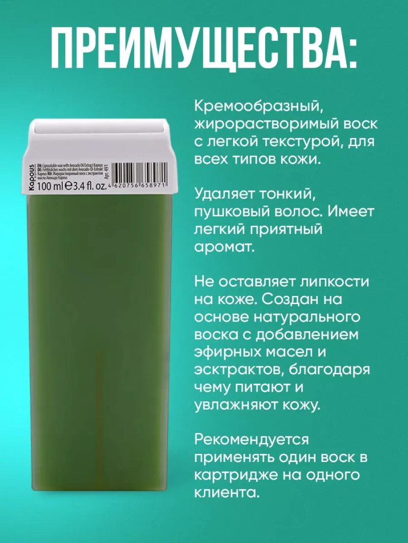 Наша новинка - воск депиляционный для всех типов кожи. Этот жирорастворимый воск с экстрактом масла Авокадо с широким роликом станет вашим идеальным помощником в создании гладкой и шелковистой кожи. Забудьте о нежелательных волосках и дарите себе роскошь безболезненной депиляции в домашних условиях. Наш кремообразный воск обладает уникальной формулой, которая обеспечит легкое и быстрое удаление волос. Его богатый состав, насыщенный экстрактом масла Авокадо и эфирными маслами, не только эффективно удаляет волосы, но и заботится о вашей коже, обеспечивая ей питание и увлажнение. С легкой текстурой воск легко наносится, а широкий ролик обеспечивает комфорт и скорость в процессе депиляции. Преимущества нашего воска впечатляют: он не оставляет липкости на коже, что позволяет вам наслаждаться гладкостью и комфортом после процедуры. Приятный аромат делает процесс депиляции более приятным, создавая атмосферу настоящего ухода за собой. Рекомендуем использовать один воск в картридже на одного клиента, что обеспечит экономию средств и высокое качество депиляции. С помощью воска депиляционного для всех типов кожи вы можете легко и быстро избавиться от нежелательных волосков. Просто следуйте нашим простым инструкциям: разогрейте воск, нанесите его на кожу, накройте бумагой для депиляции и удалите резким движением. Эта техника обеспечивает максимально эффективную депиляцию, позволяя вам наслаждаться идеальной гладкостью. Не упустите возможность попробовать наш эксклюзивный жирорастворимый воск с экстрактом масла Авокадо! Закажите его прямо сейчас и откройте для себя новый уровень ухода за кожей. Ваша кожа будет словно шелковистый цветок, расцветающий в солнечном луче, а вы почувствуете себя великолепно!